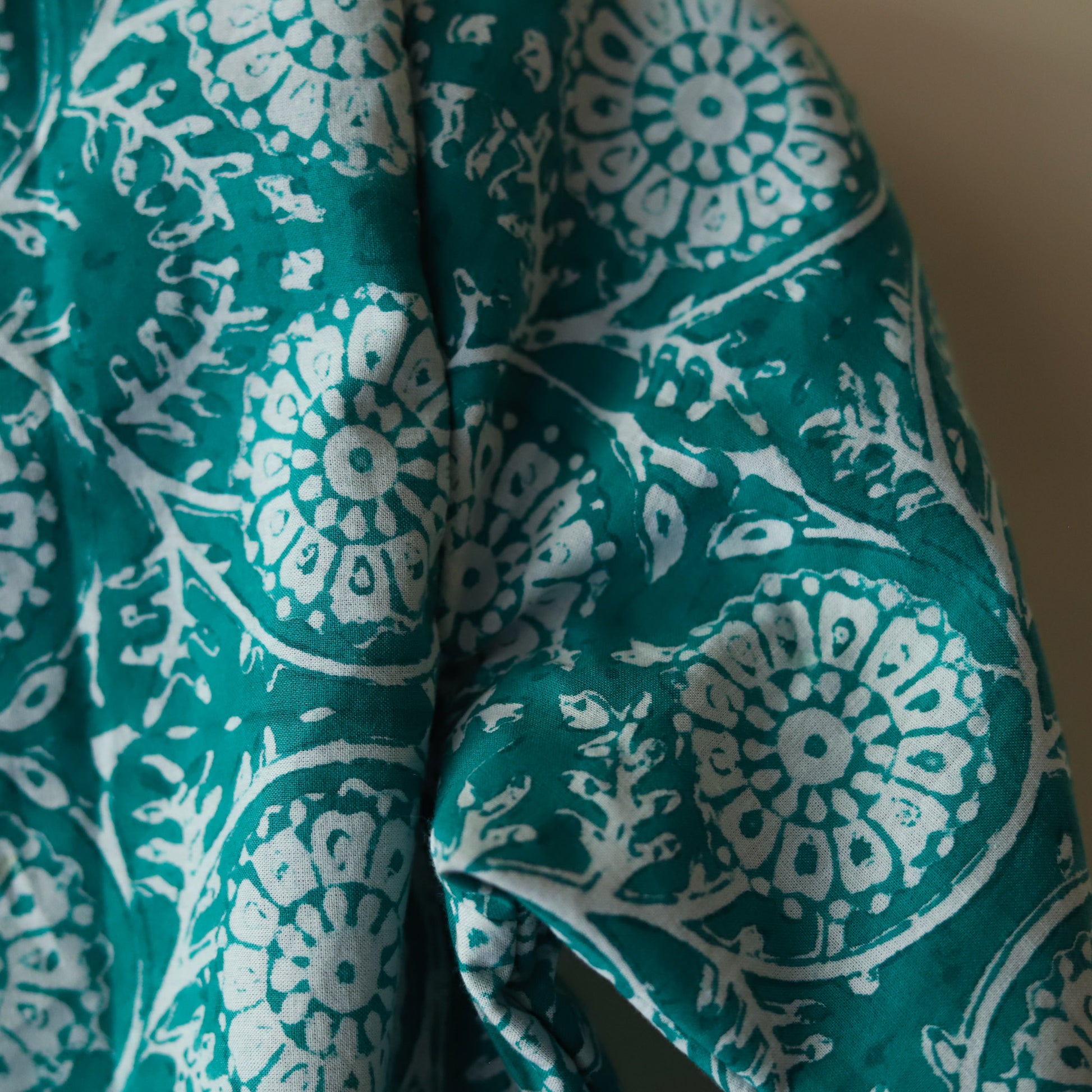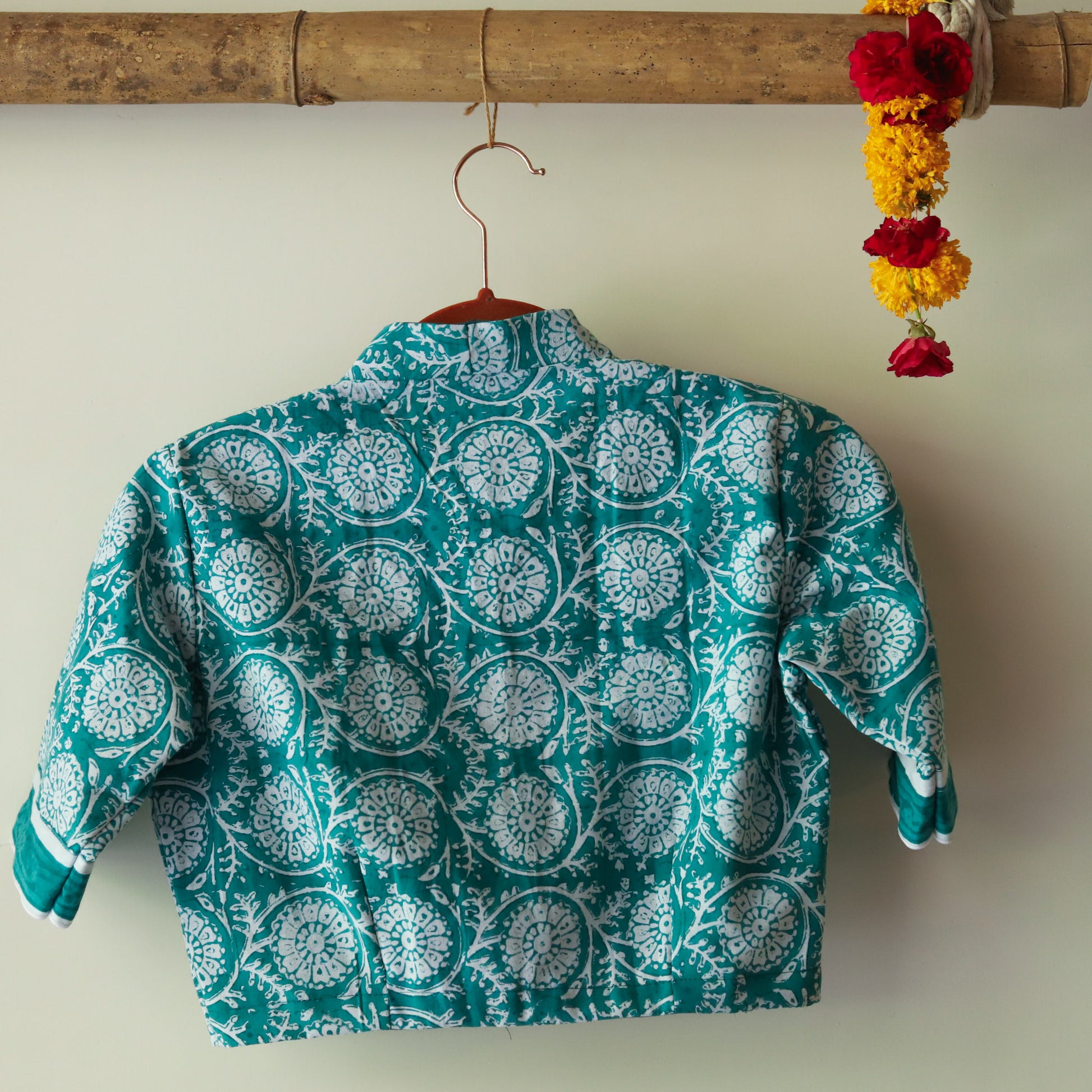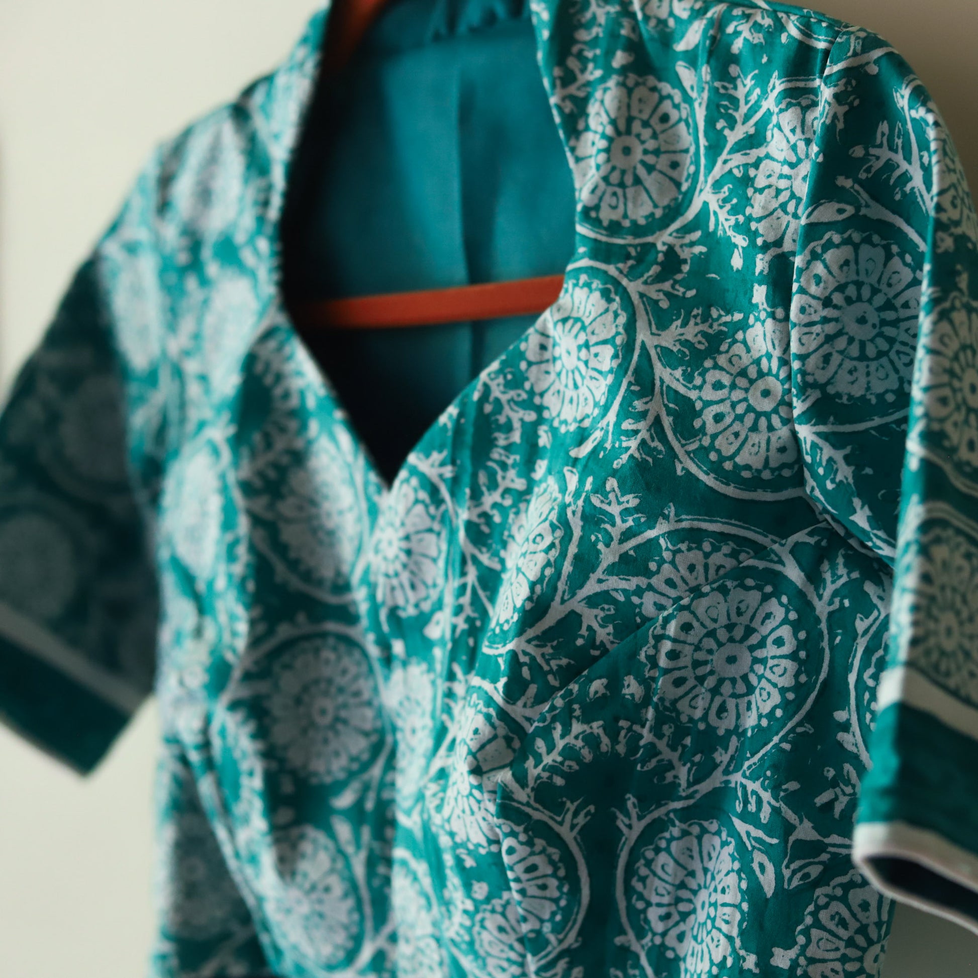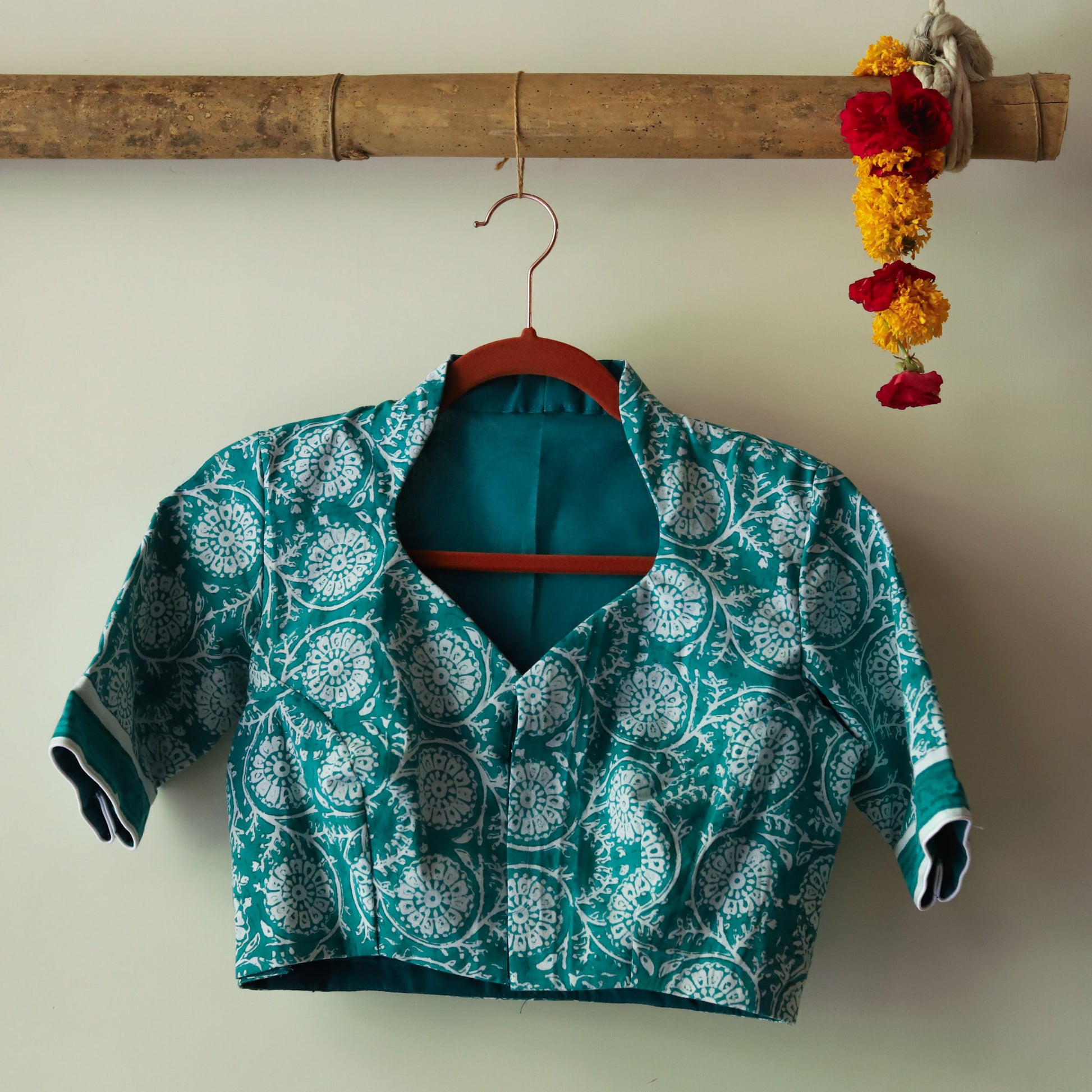 TITLI collection of blouses reminds of light weight with intricate patterns or designs. We present to you Titli blouse which is the best deal you can have as made its solely for you. Its perfect for all the special occasions. Also perfect summer blouse. This blouse is simple and elegant like the Sharmila Tagore style of blouse, in pure cotton fabric with organic print.