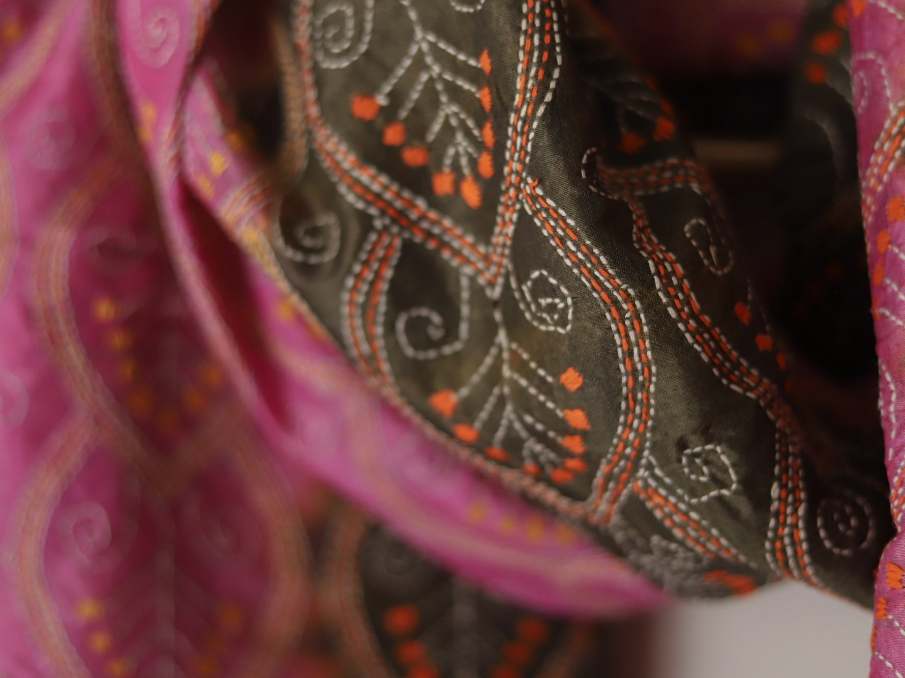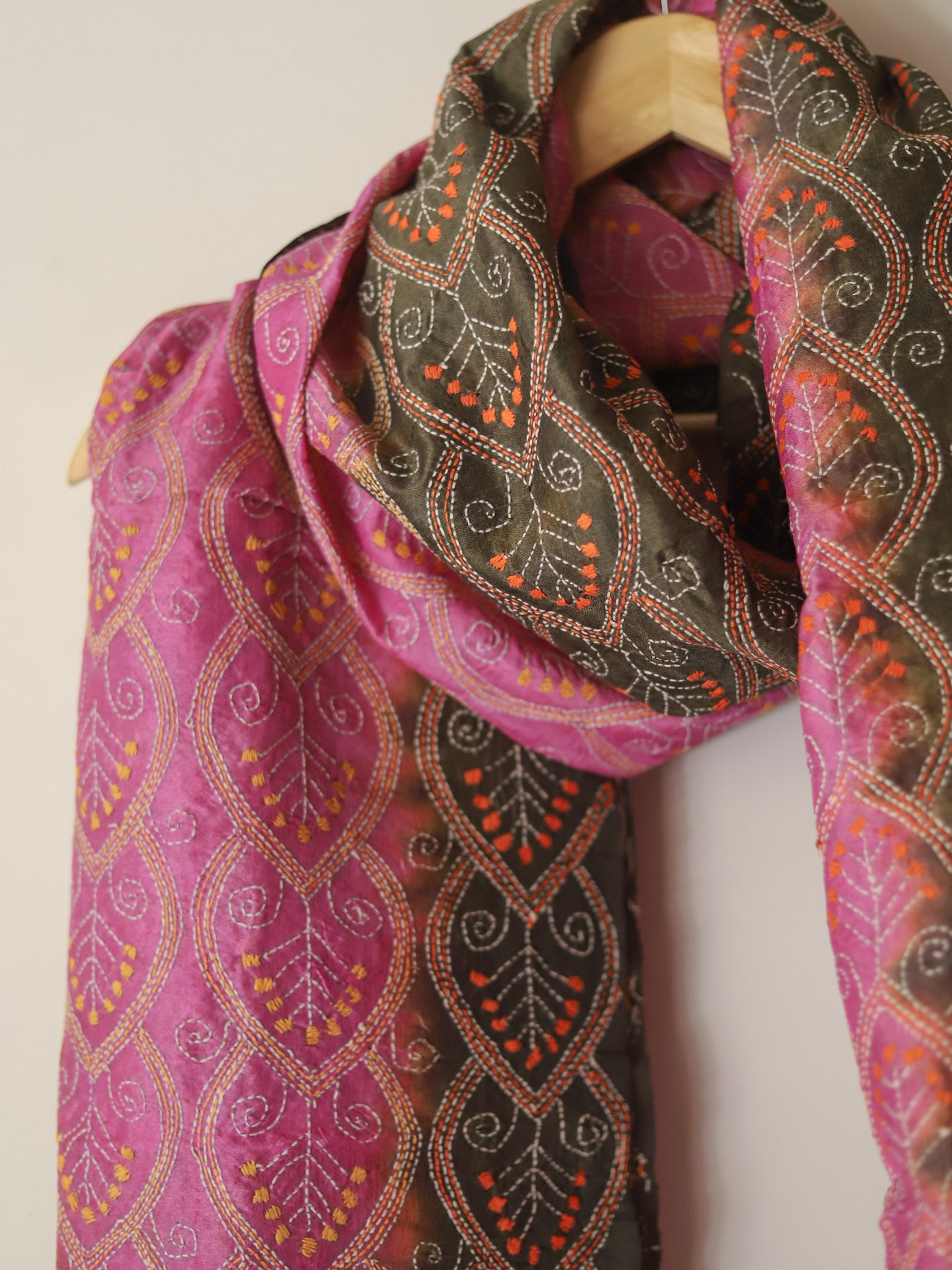 Kantha, the ancient running stitch embroidery of Bengal, adds intricate patterns and vibrant character to these elegant scarves. The lightweight yet sumptuous texture makes these versatile pieces perfect for both everyday elegance and special occasions.