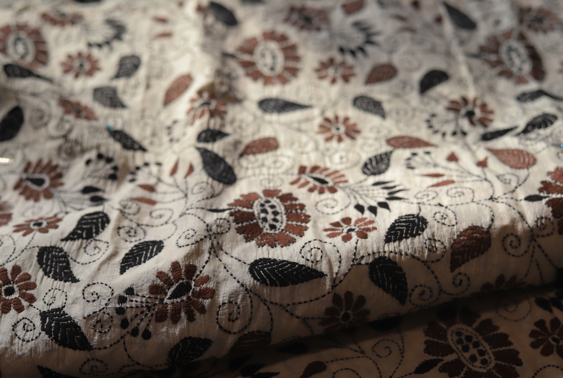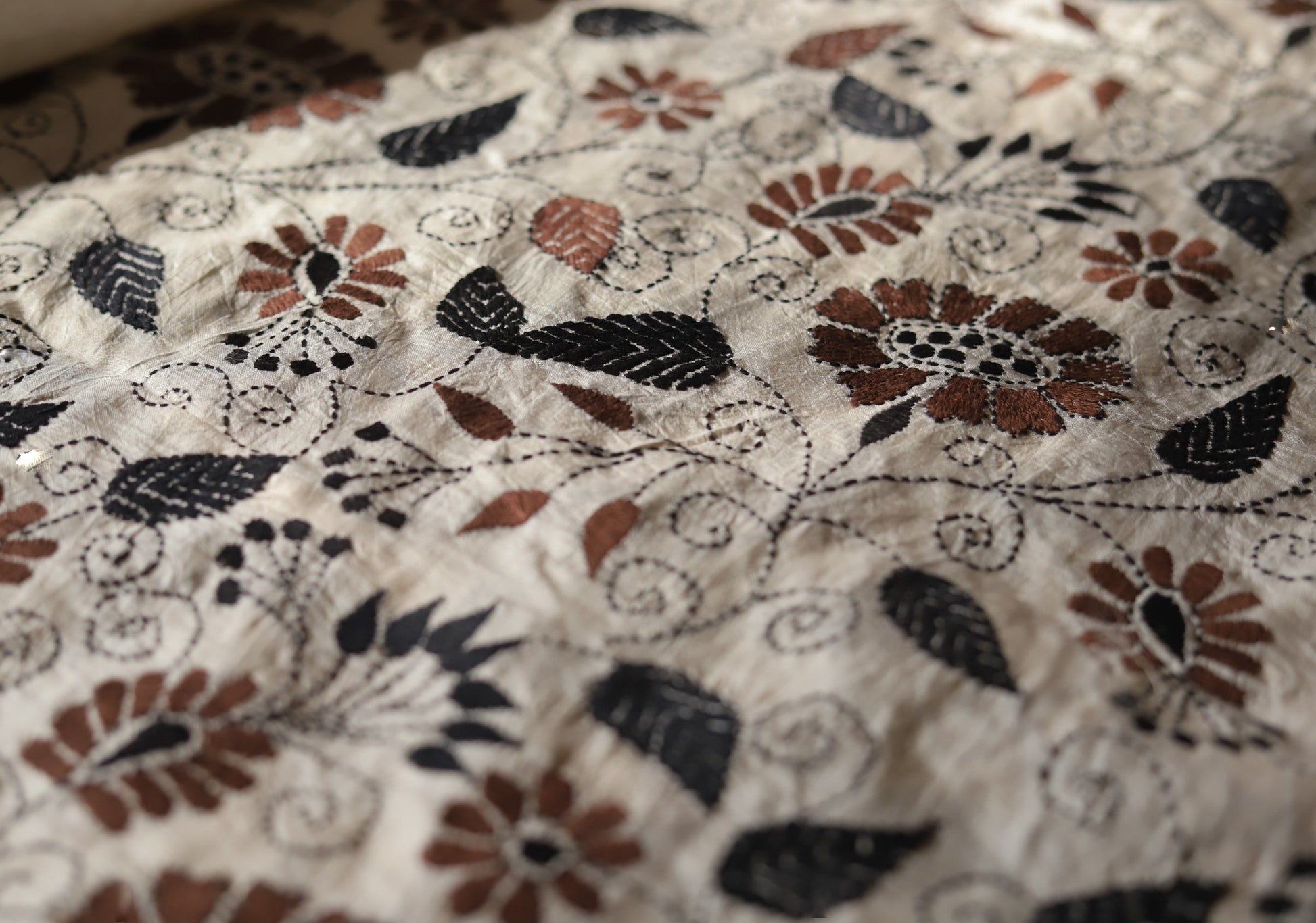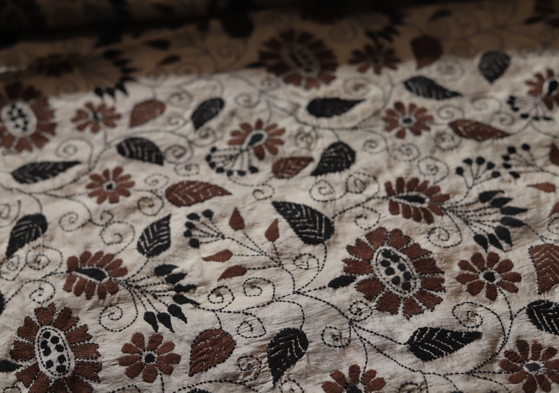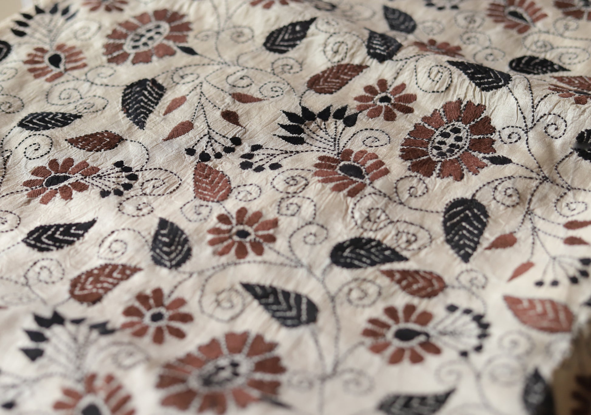 Kadambini is more than a saree, it is a living testament to Bengal’s Kantha tradition. Each piece begins with 100 % pure mulberry silk, whose natural sheen and supple drape form the perfect canvas for master artisans. Over several days, they guide thousands of tiny running stitches known locally as nakshi kantha across the fabric, creating intricate motifs that echo the art’s humble origins, when women repurposed household cloth into embroidered heirlooms. The result is a feather‑light, breathable saree that gains softness with every wear yet remains strong enough to be cherished by future generations.