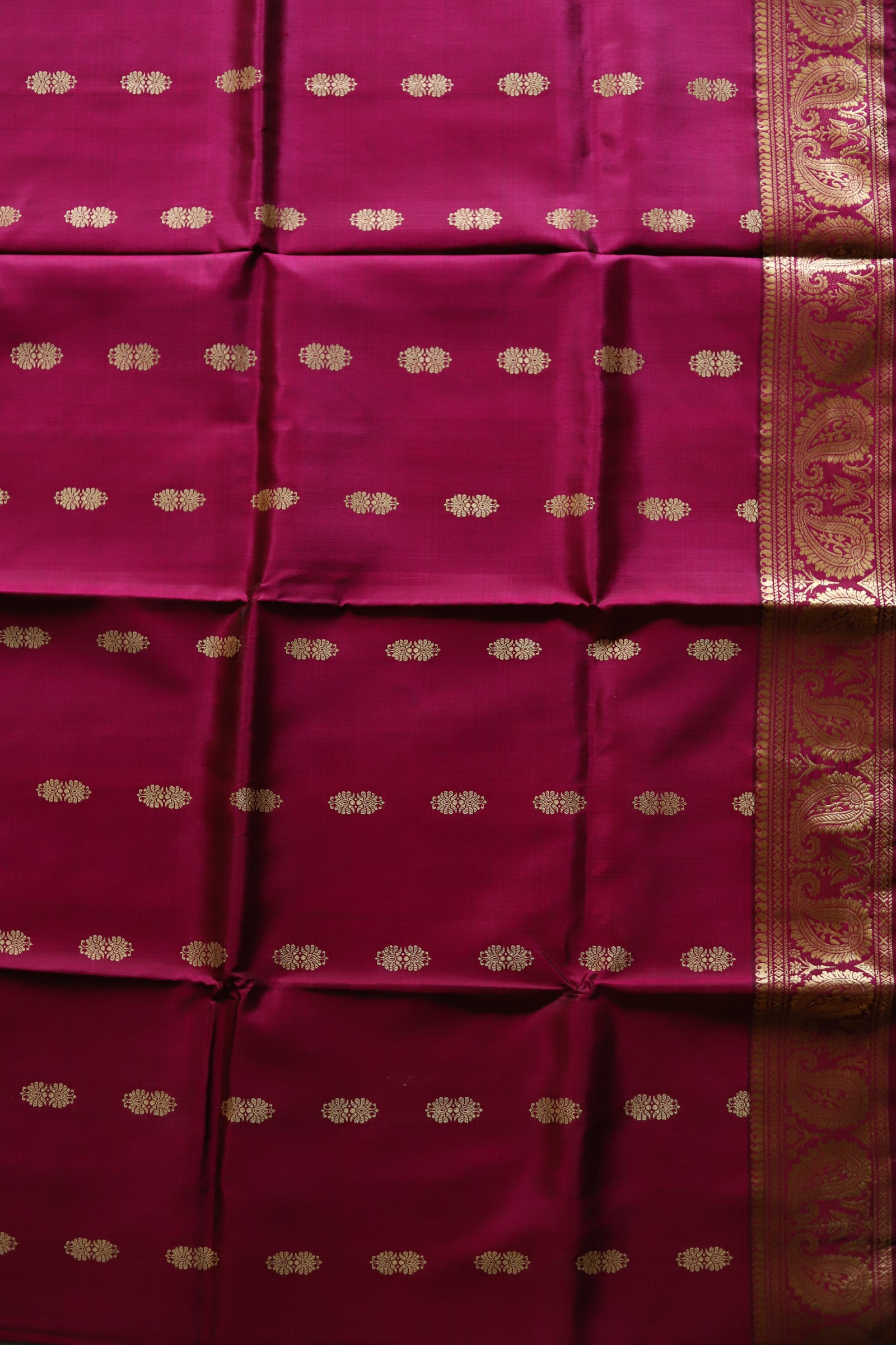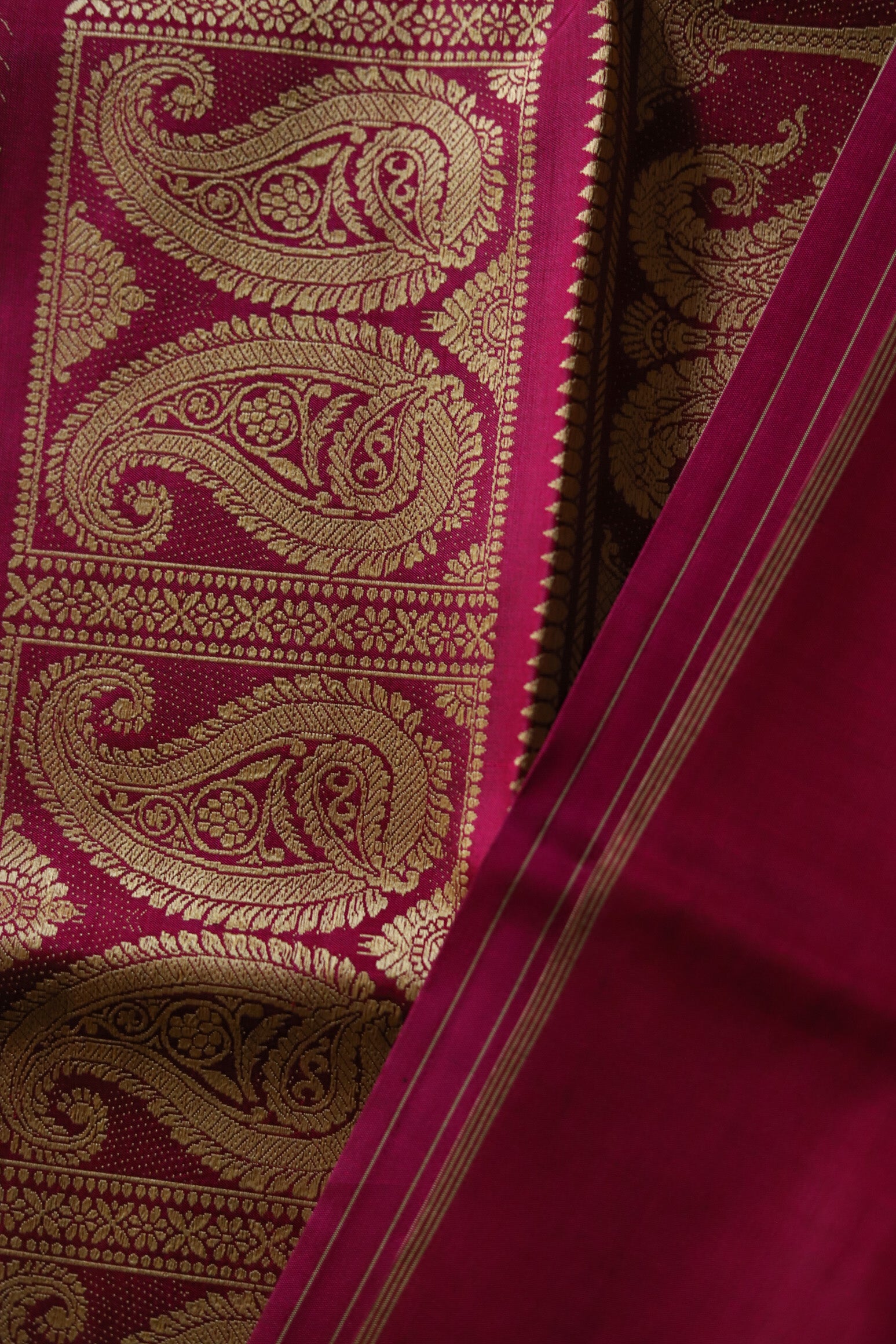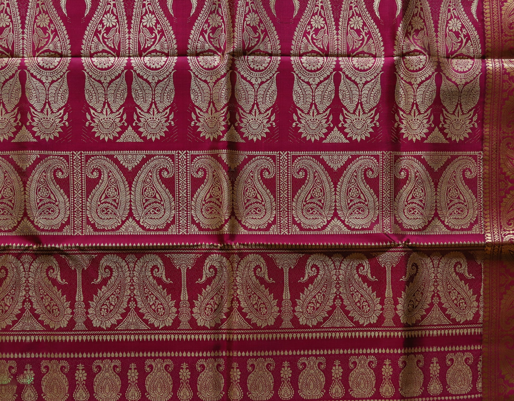 Originating in the 18th century from the historic weaving village of Baluchar in Murshidabad, Baluchari sarees were once patronised by Bengal’s Nawabs and admired by European traders for their luxurious craftsmanship. While traditional Balucharis are known for narrative pallus depicting epics, the contemporary evolution of this weave embraces ornamental motif based pallus like the exquisite paisley, floral and foliage patterns seen here. Each motif is intricately woven on pure silk, creating a pallu that resembles a rich tapestry of symmetrical artistry rather than storytelling scenes.