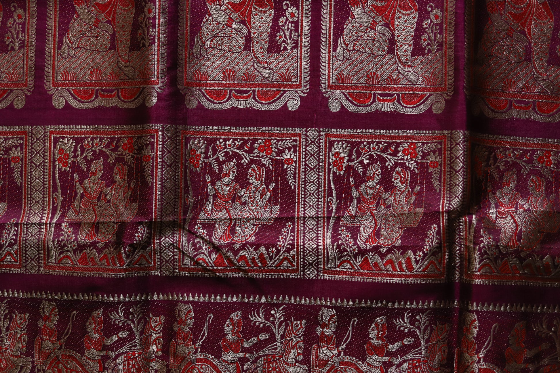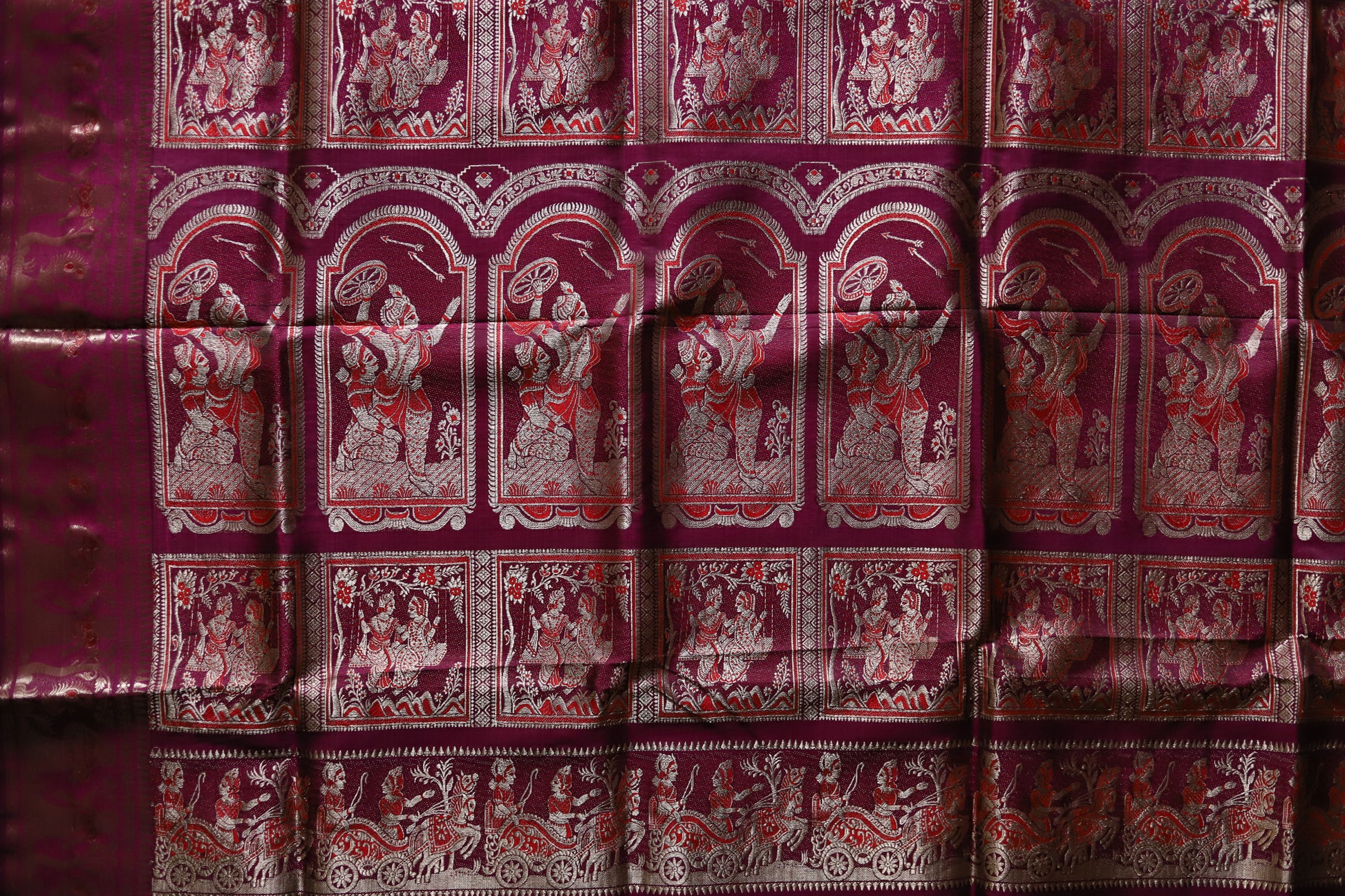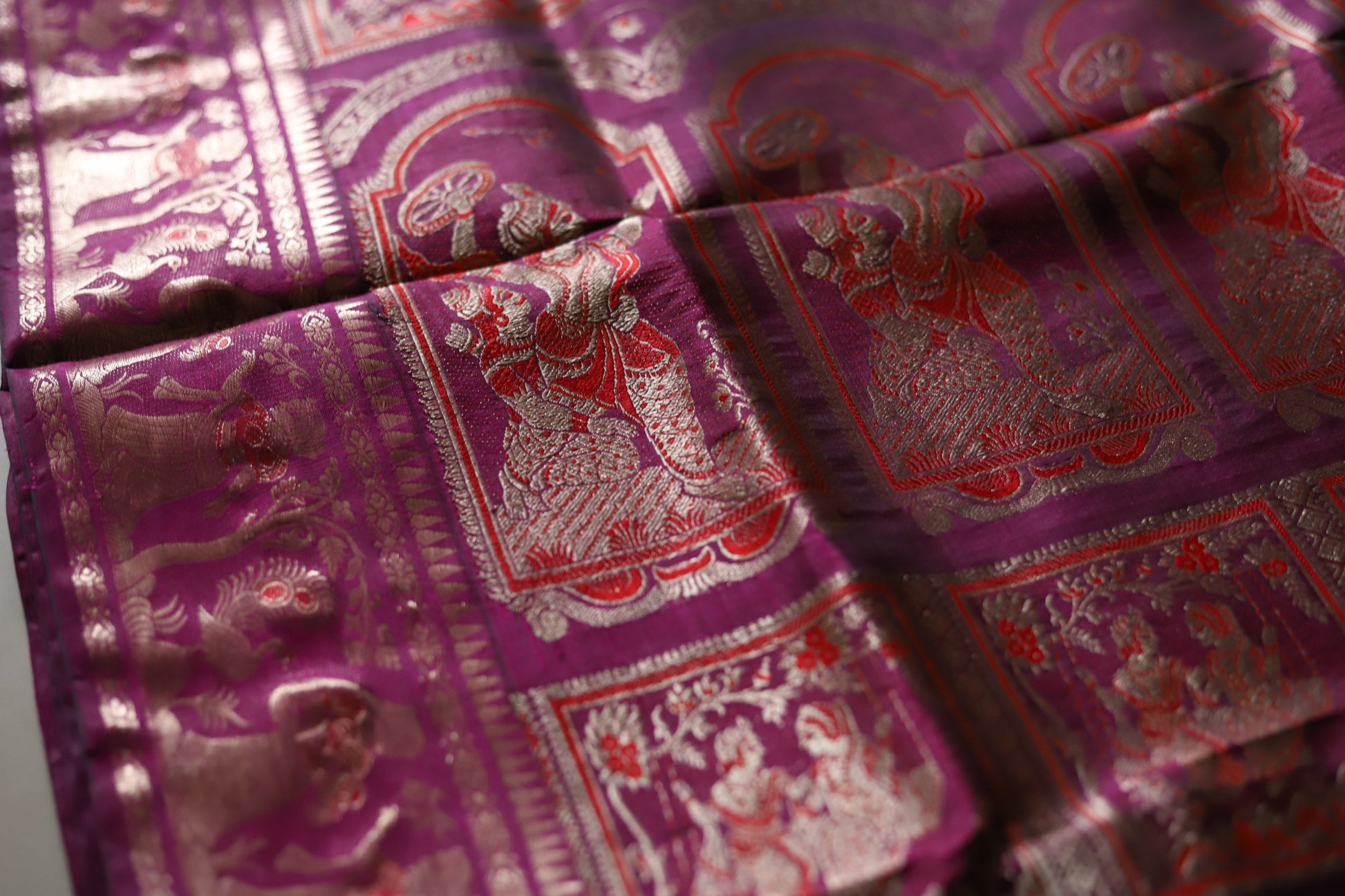Originating in the weaving clusters of Bishnupur in Bankura district, Swarnachari (also known as Swarnachuri) emerged as a regal evolution of the traditional Baluchari during the 20th century. While Baluchari originally featured intricate silk motifs, Swarnachari elevated the craft by introducing real zari and gold-toned threads, giving the saree its signature opulent sheen. Patronised by Bengal’s elite and admired across India for its luminous craftsmanship, Swarnachari quickly became synonymous with luxury, artistry and heritage. What makes it truly iconic is its richly woven pallu and borders adorned with detailed zari work, floral vines, paisleys, architectural patterns and sometimes narrative motifs each panel shimmering like a hand-crafted tapestry in gold.