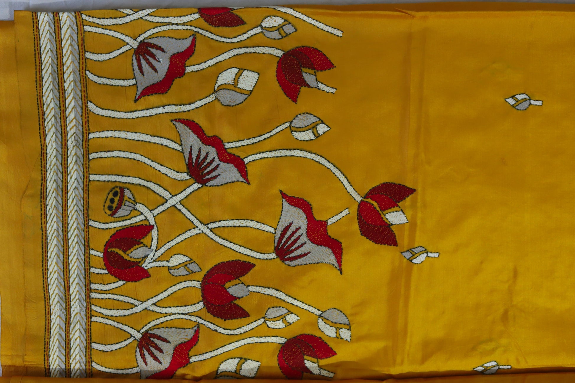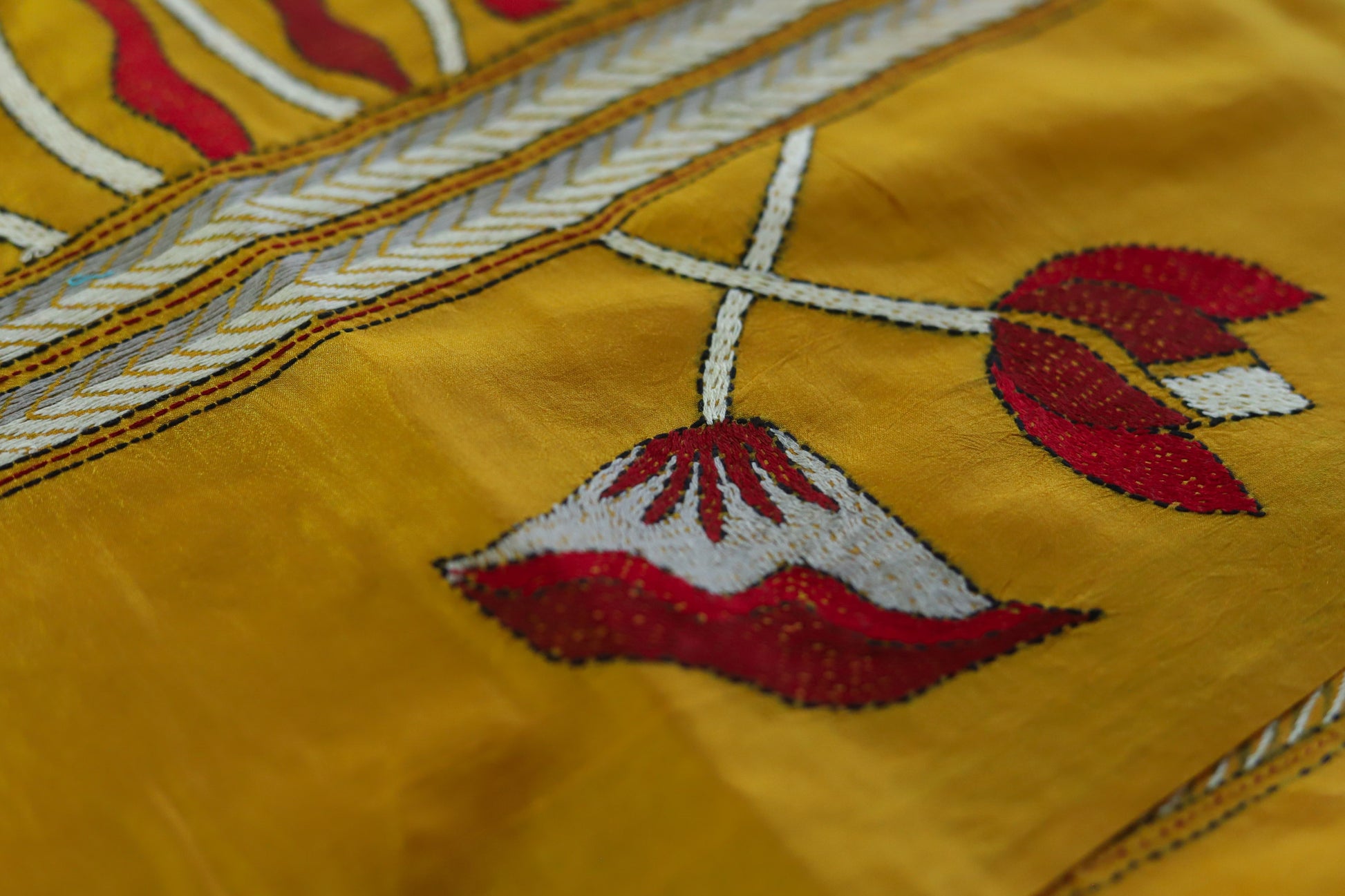 Kadambini is more than a saree, it is a living testament to Bengal’s Kantha tradition. Each piece begins with 100 % pure mulberry silk, whose natural sheen and supple drape form the perfect canvas for master artisans. Over several days, they guide thousands of tiny running stitches known locally as nakshi kantha across the fabric, creating intricate motifs that echo the art’s humble origins, when women repurposed household cloth into embroidered heirlooms. The result is a feather‑light, breathable saree that gains softness with every wear yet remains strong enough to be cherished by future generations.