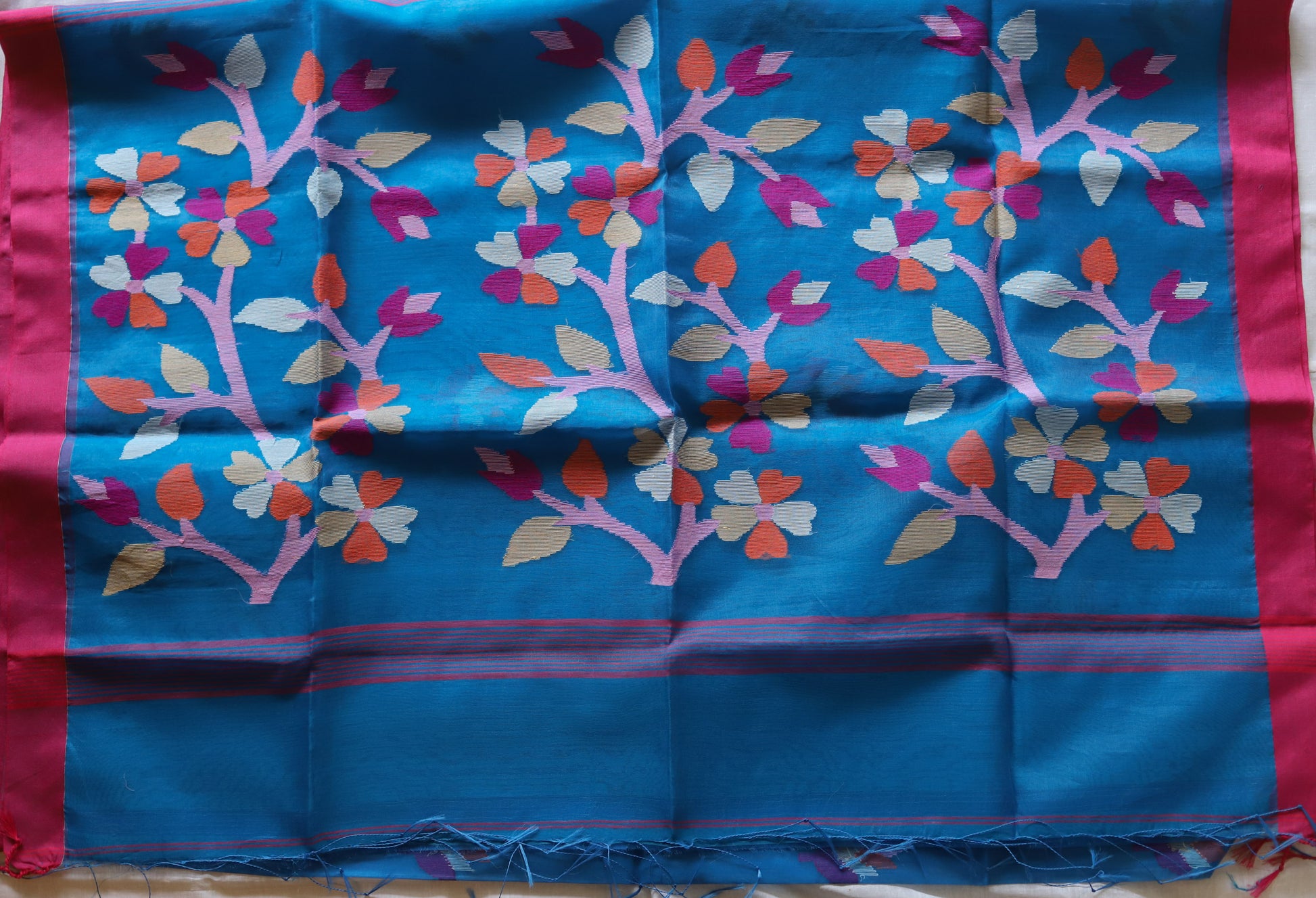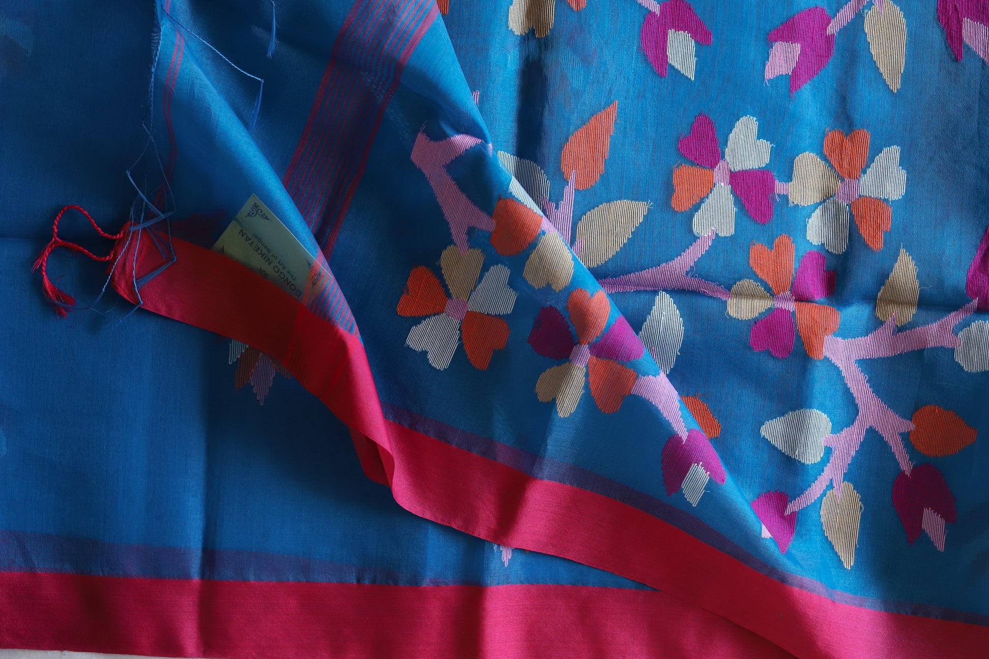 This is a handwoven saree that is meticulously created by the artisans of Bengal. The art of hand weaving is labour intensive and takes a longer time. But, the beauty it adds to the fabric is priceless.