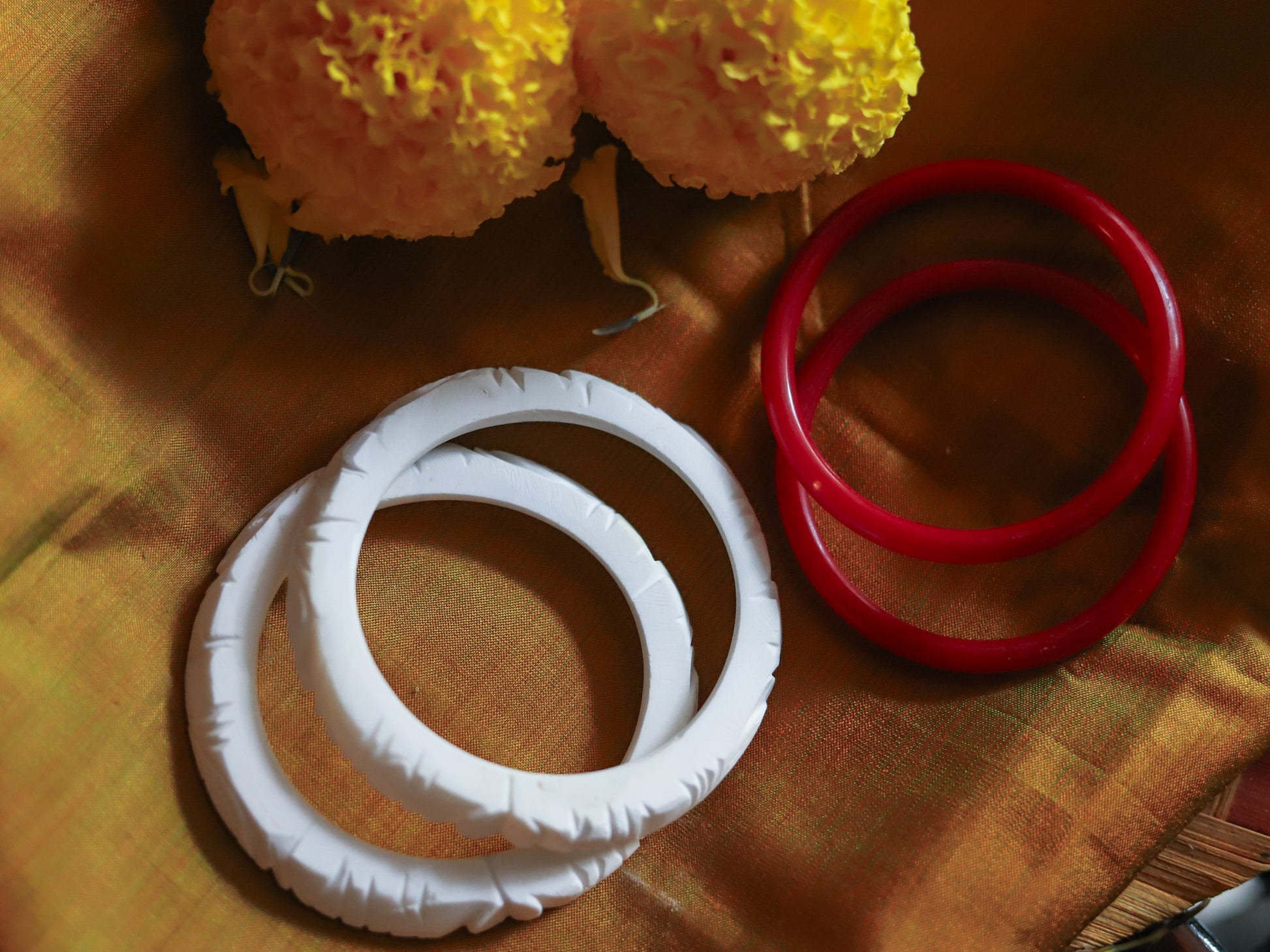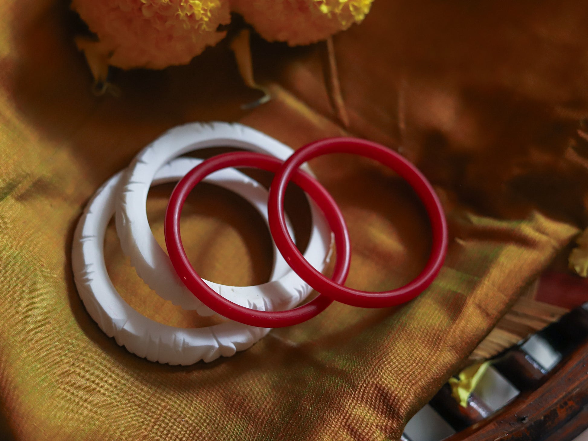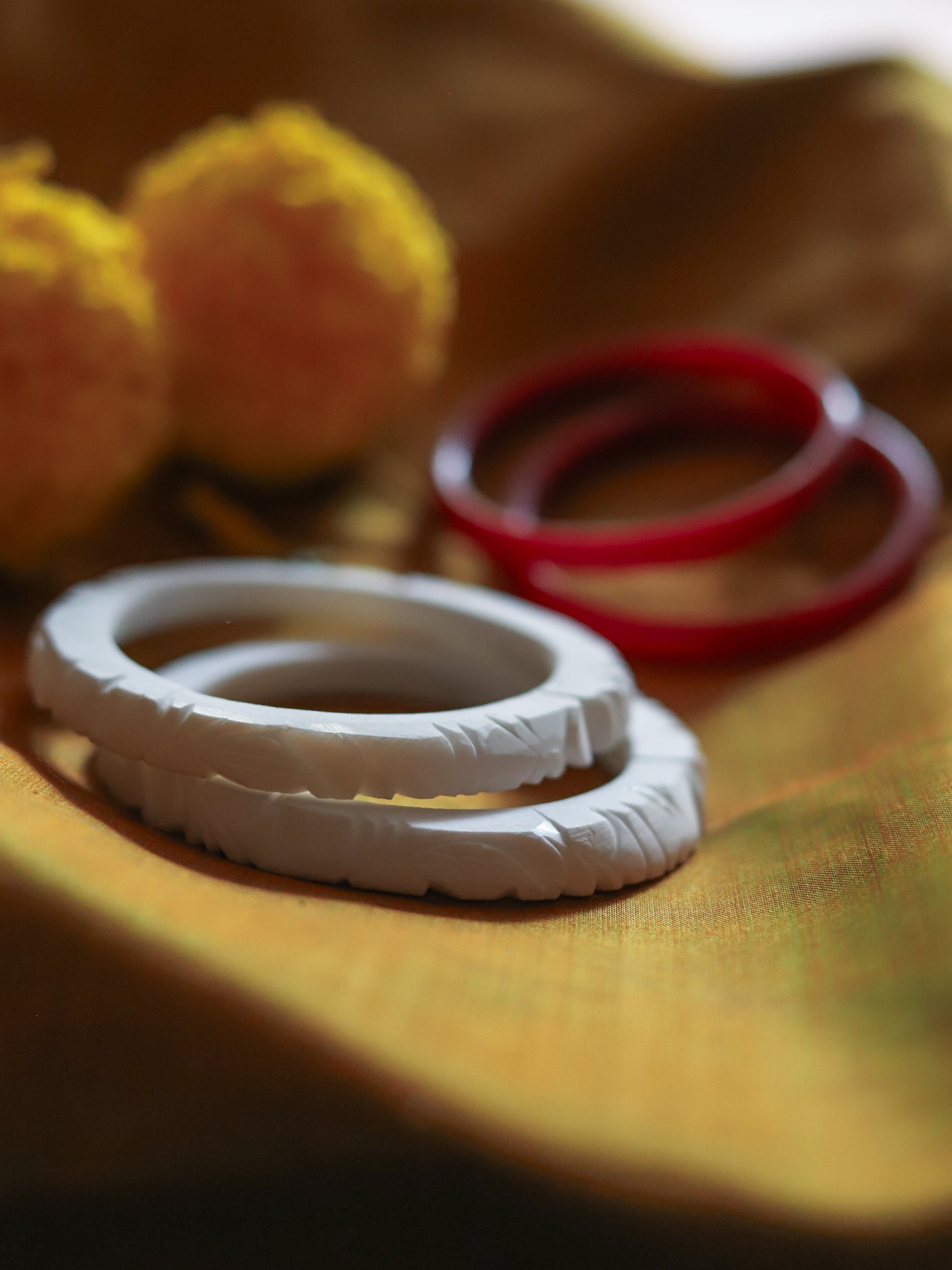 In the cultural landscape of Bengal, the Shakha–Pola (White–Red bangle pair) holds a sacred and deeply symbolic place in a woman’s life. The Shakha, a white bangle meticulously hand-carved from natural conch shell sourced from the Indian Ocean, is traditionally worn by married Hindu women of Bengal. It is paired with the Pola, a striking red bangle crafted to complement it together forming a powerful emblem of marriage, prosperity, and auspicious beginnings. Rooted in centuries-old ritual and belief, this combination is not merely ornamental, but a living tradition passed through generations.