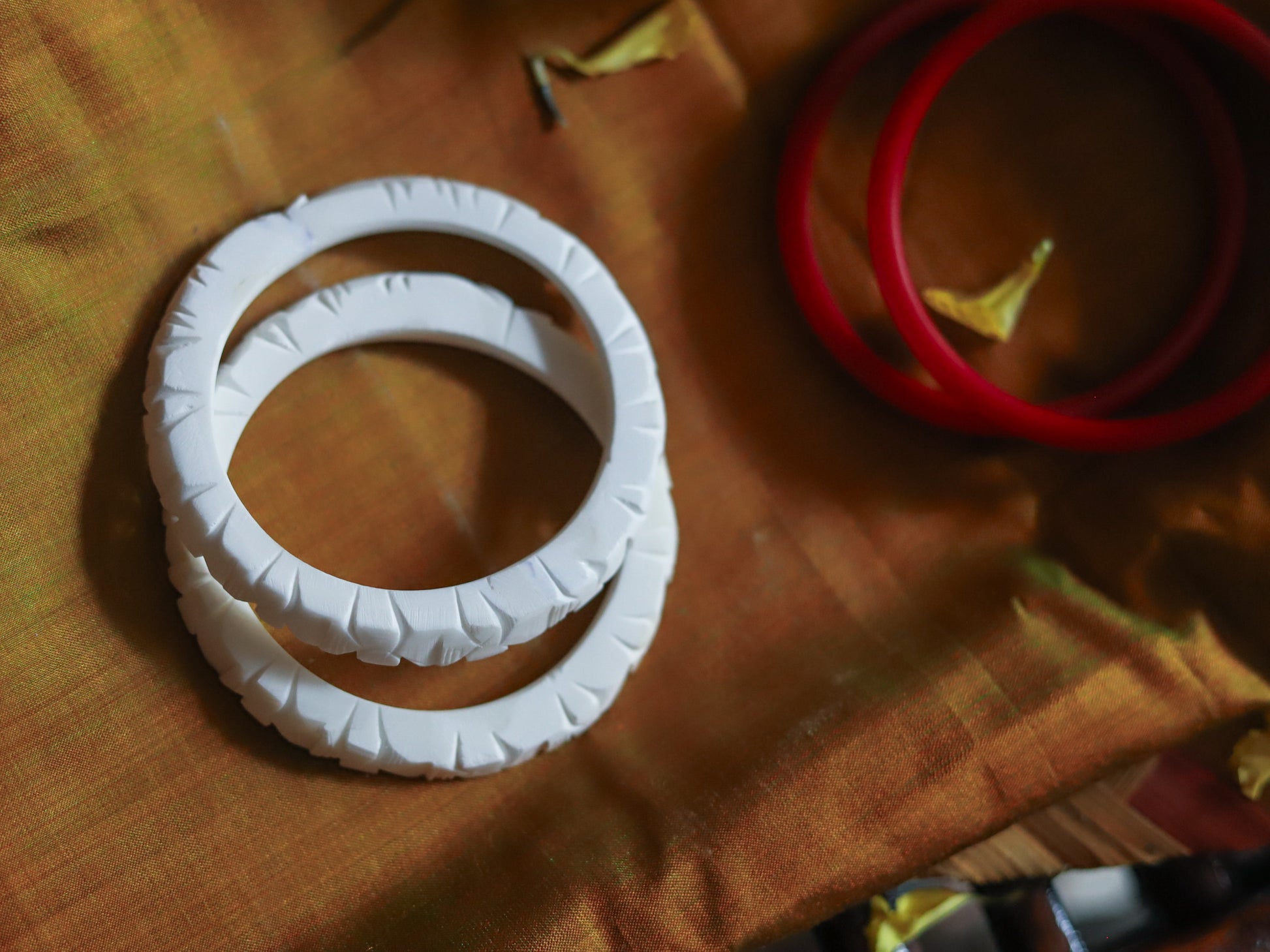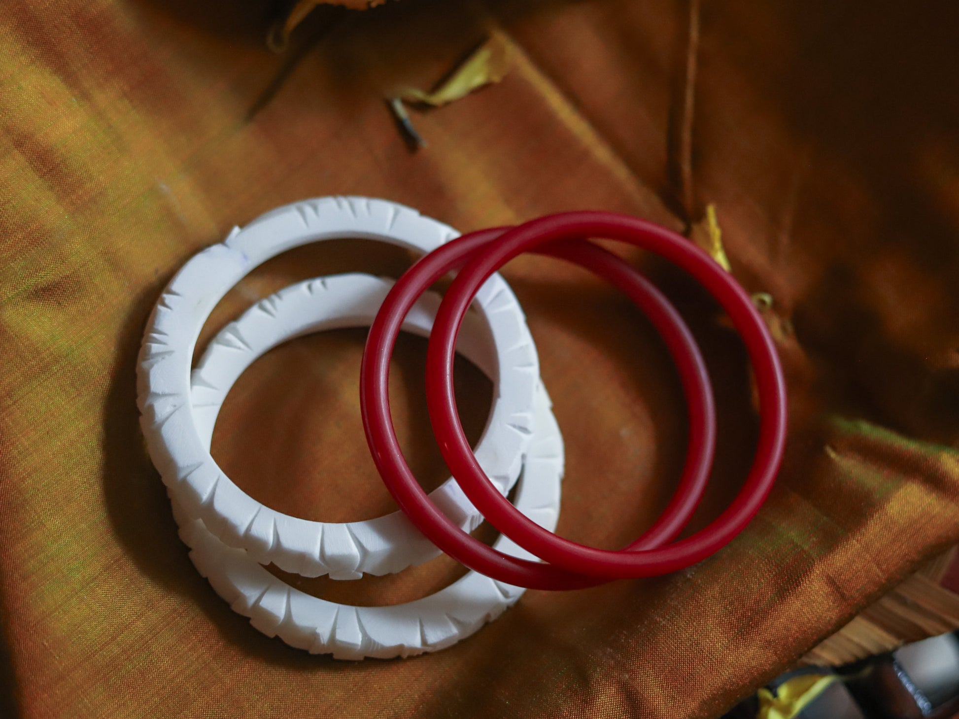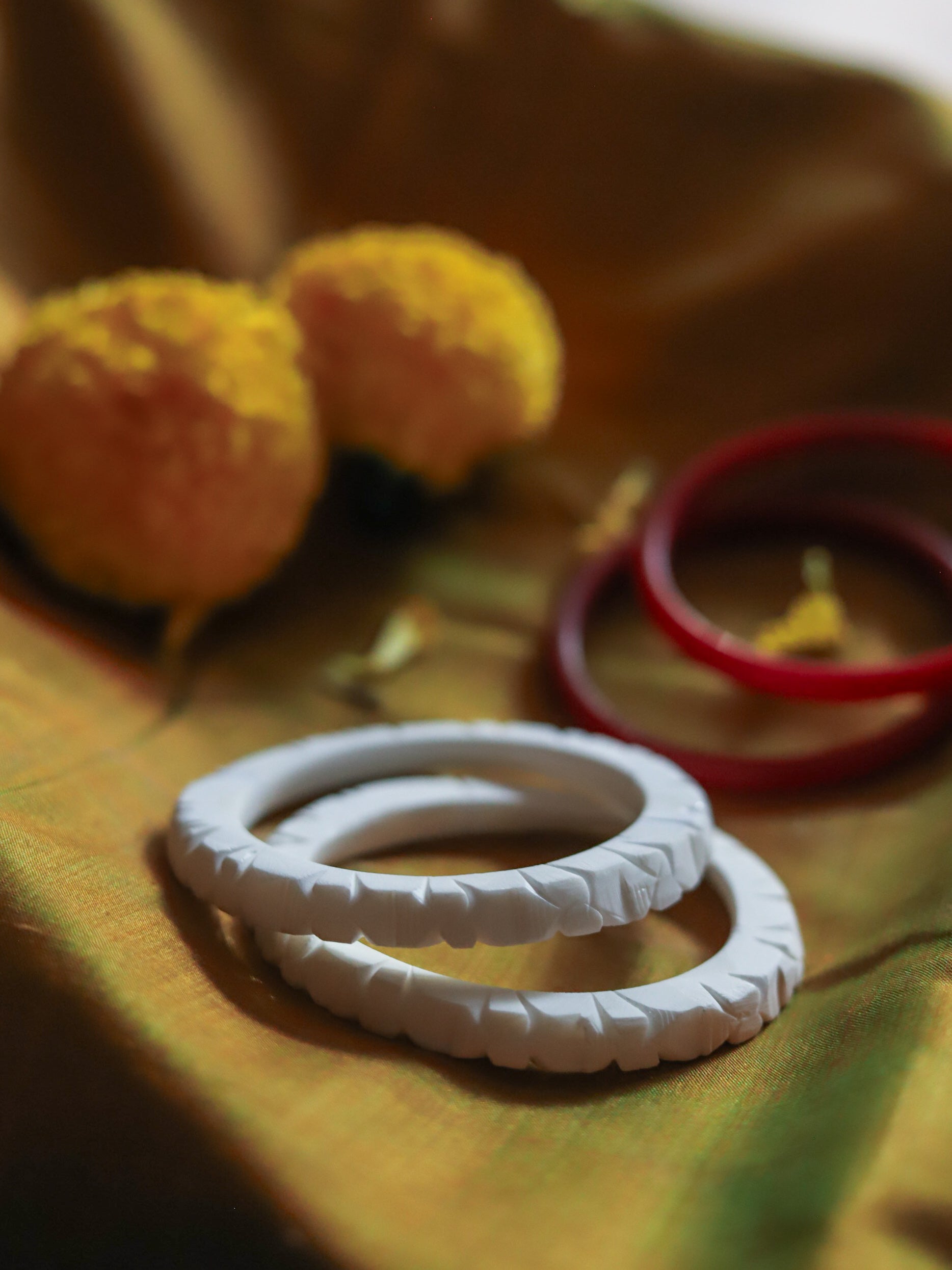 In the cultural landscape of Bengal, the Shakha–Pola (White–Red bangle pair) holds a sacred and deeply symbolic place in a woman’s life. The Shakha, a white bangle meticulously hand-carved from natural conch shell sourced from the Indian Ocean, is traditionally worn by married Hindu women of Bengal. It is paired with the Pola, a striking red bangle crafted to complement it together forming a powerful emblem of marriage, prosperity, and auspicious beginnings. Rooted in centuries-old ritual and belief, this combination is not merely ornamental, but a living tradition passed through generations.