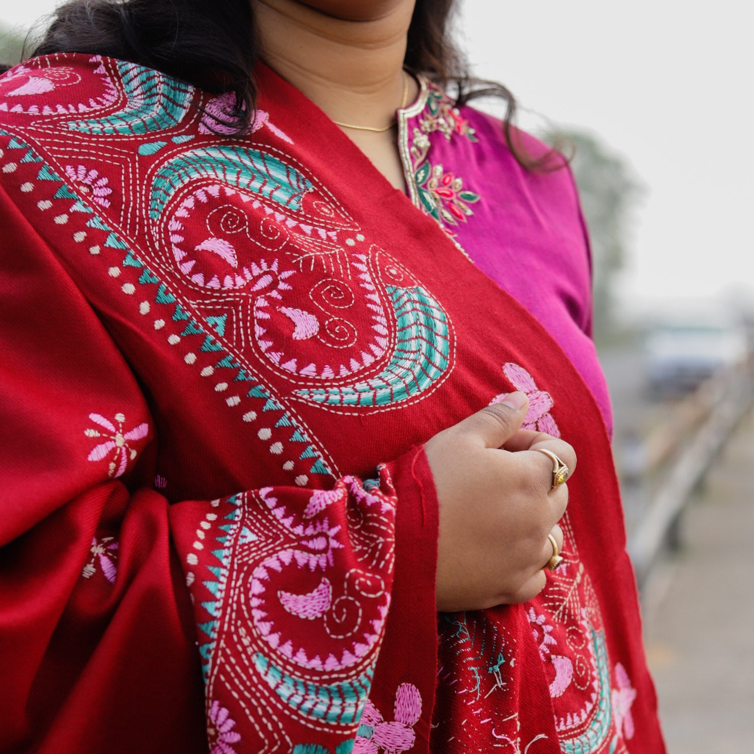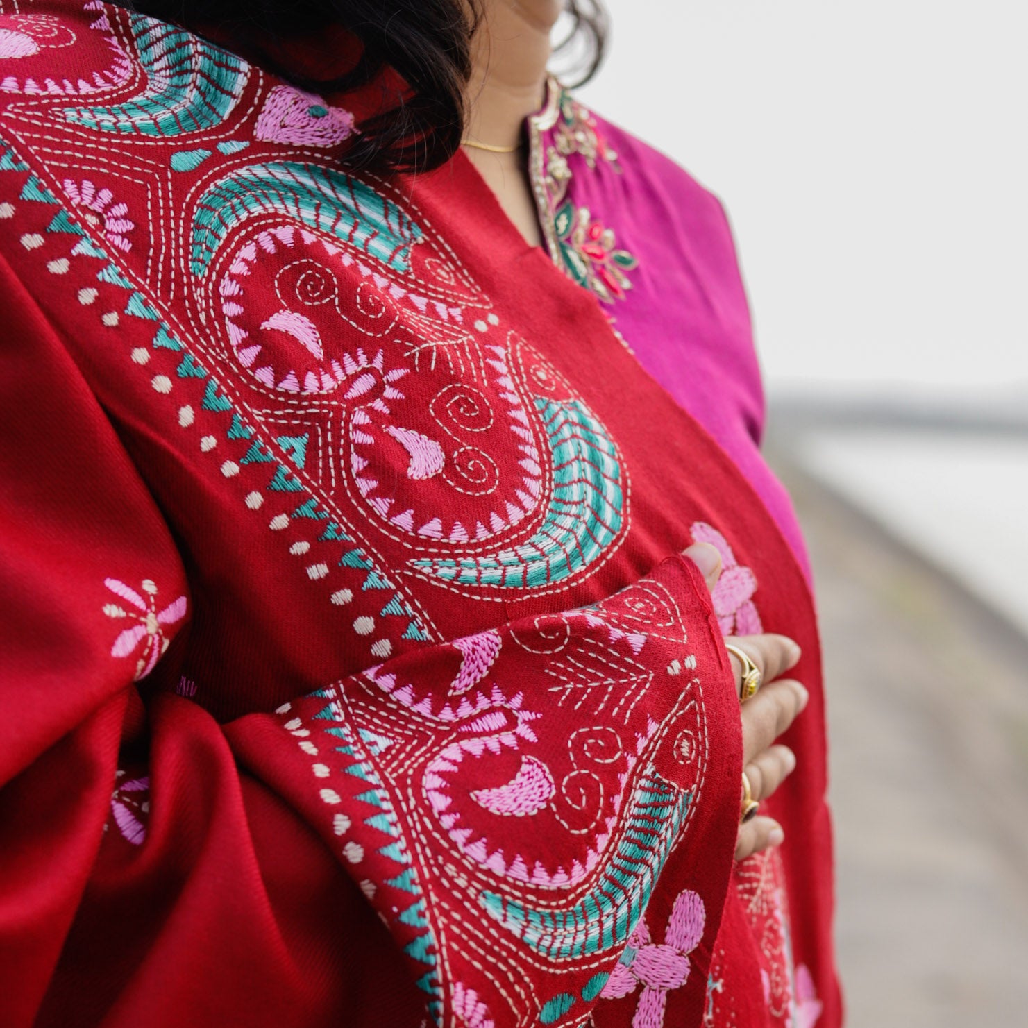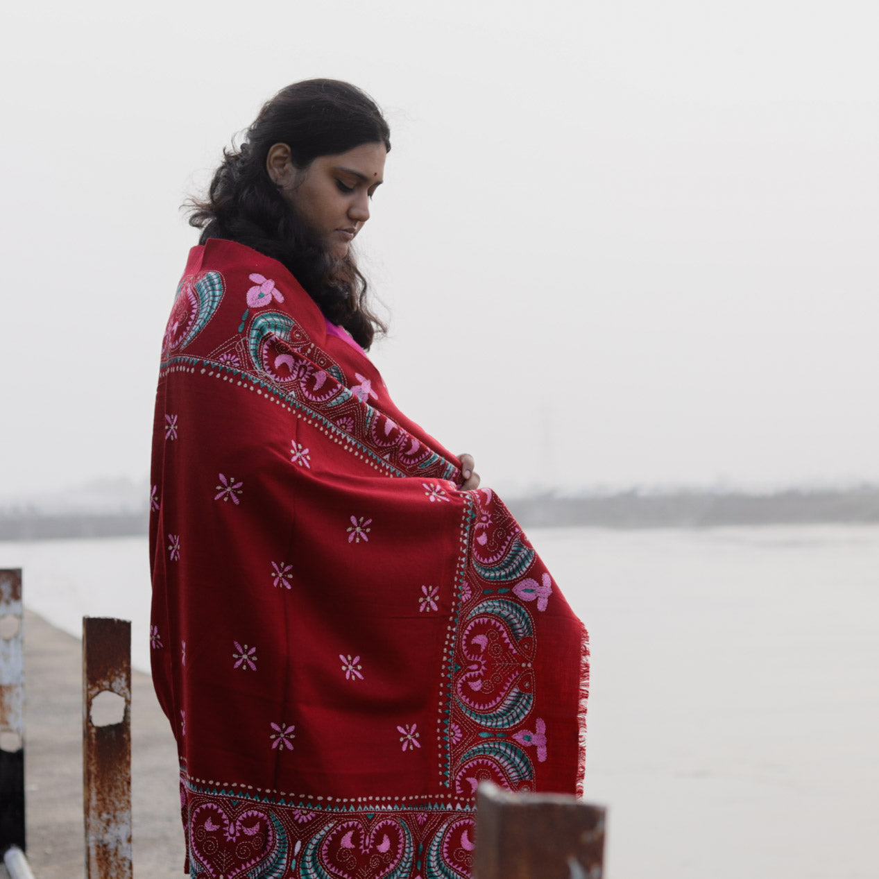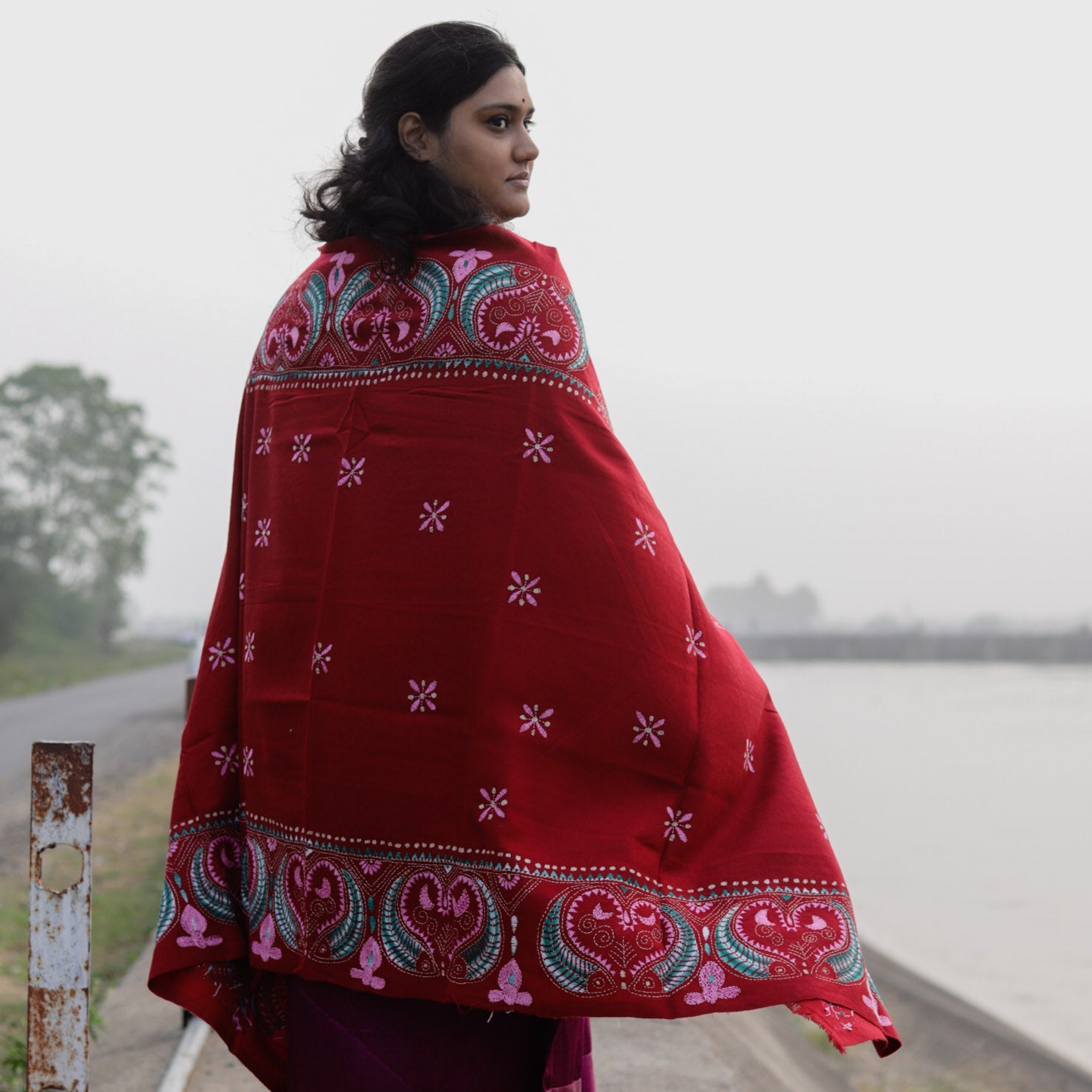 Wrap yourself in cozy elegance with our woollen shawl for women. This essential accessory is perfect for everyday wear, keeping you warm and stylish. In Bengal, shawls were introduced during the early seventeen century where the most prized woven shawls were figurative woven on the complex Naksha loom. BONGONIKETAN brings to you, the Shawls of Bengal with hand embroidery (Kantha) on wool from Kashmir in each unique handwork, it's a must have addition to your wardrobe.
