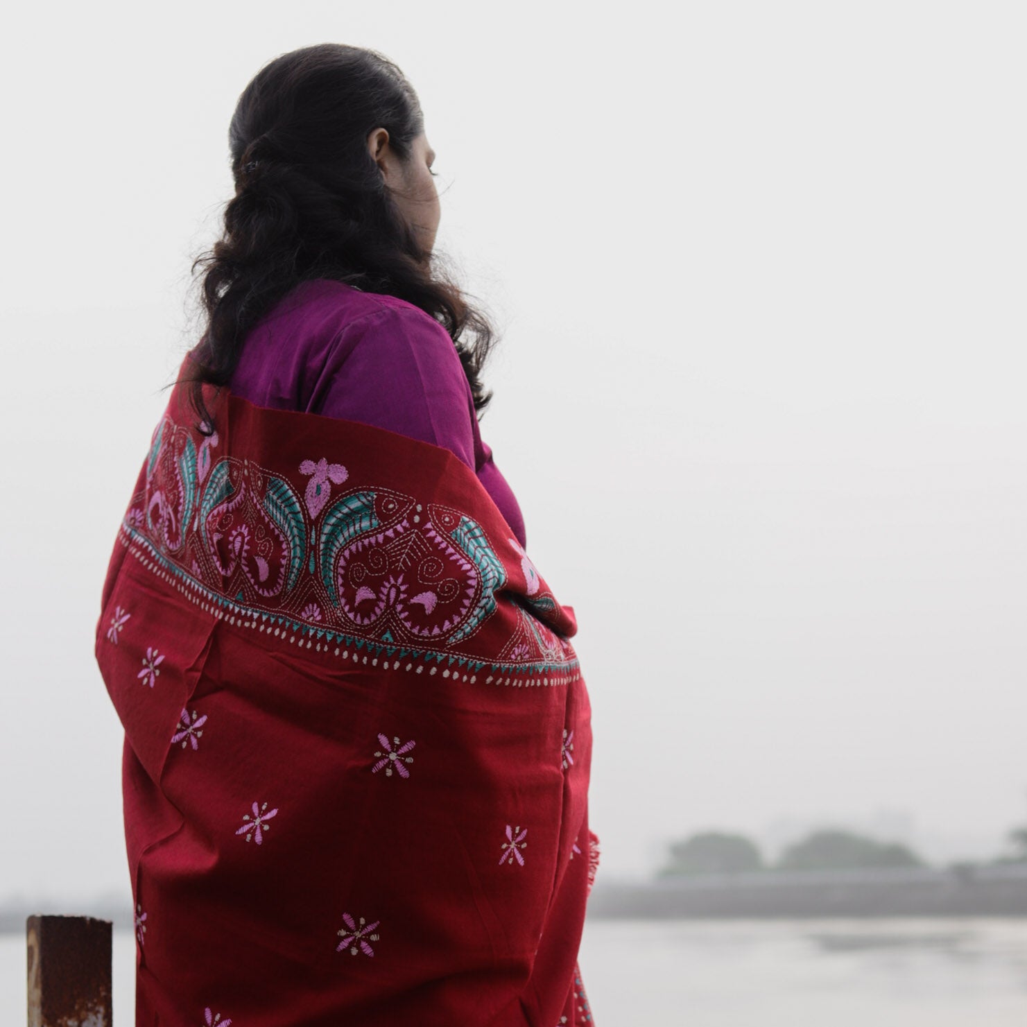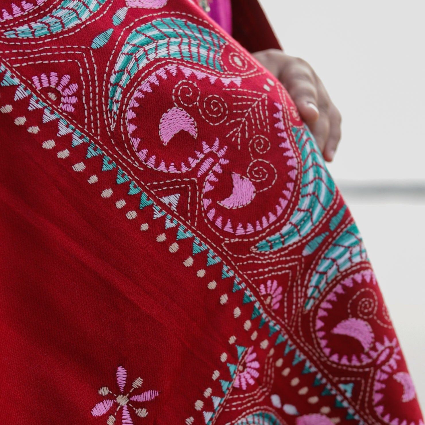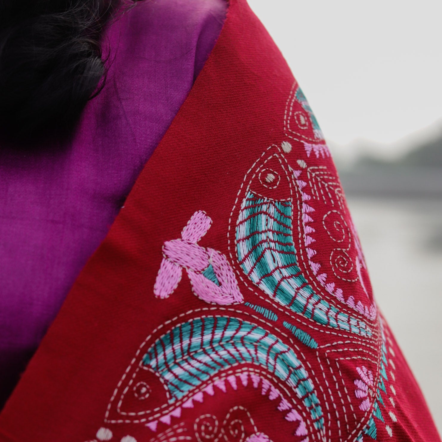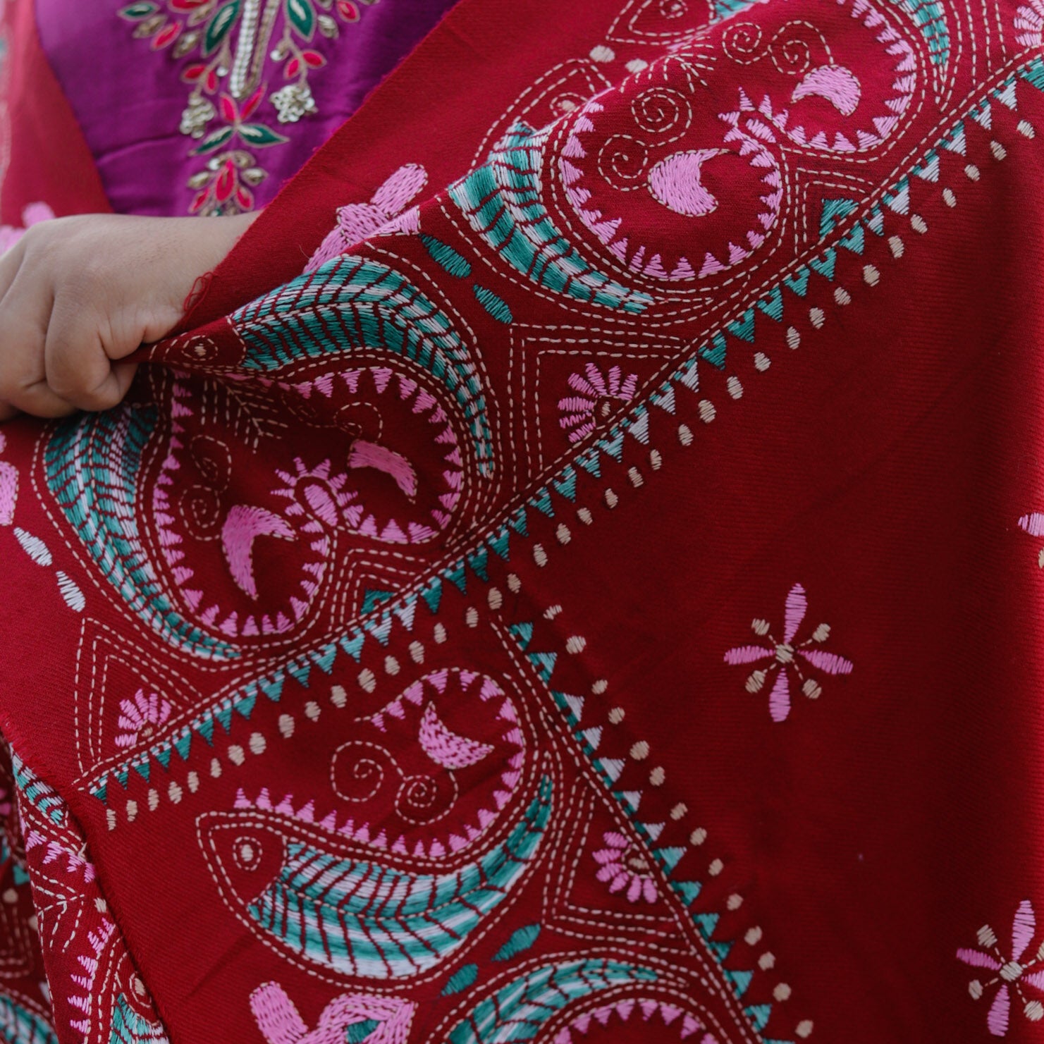 Wrap yourself in cozy elegance with our woollen shawl for women. This essential accessory is perfect for everyday wear, keeping you warm and stylish. In Bengal, shawls were introduced during the early seventeen century where the most prized woven shawls were figurative woven on the complex Naksha loom. BONGONIKETAN brings to you, the Shawls of Bengal with hand embroidery (Kantha) on wool from Kashmir in each unique handwork, it's a must have addition to your wardrobe.