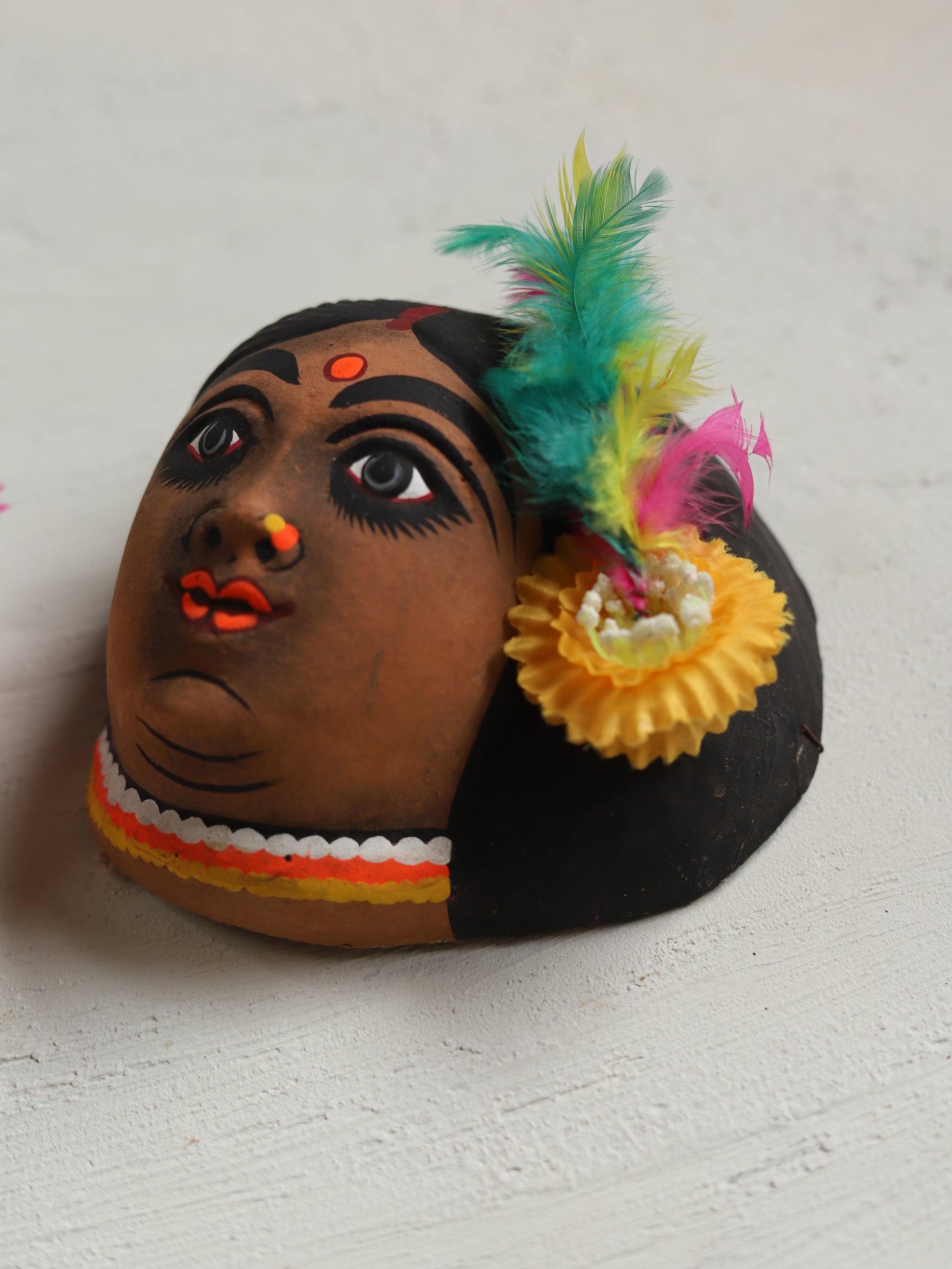 Formed using layers of hand-pressed paper and clay, sun-dried and hand-painted with intricate ornamentation, every mask is a unique artefact rich in expression, symbolism, and craftsmanship. Subtle variations in detailing and colour reflect the authenticity of true handmade artistry.