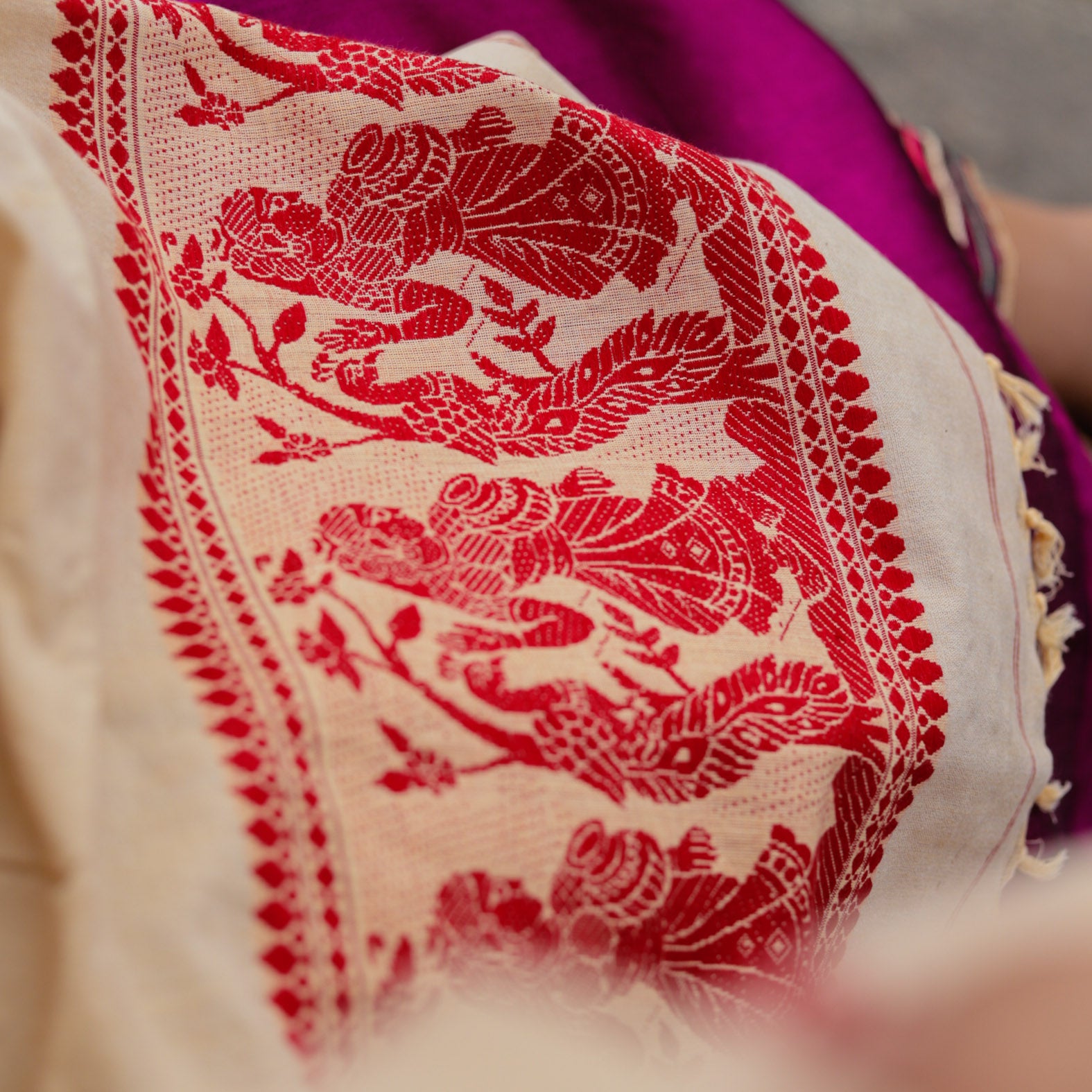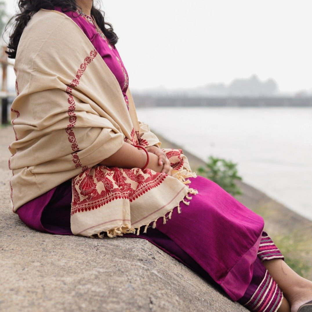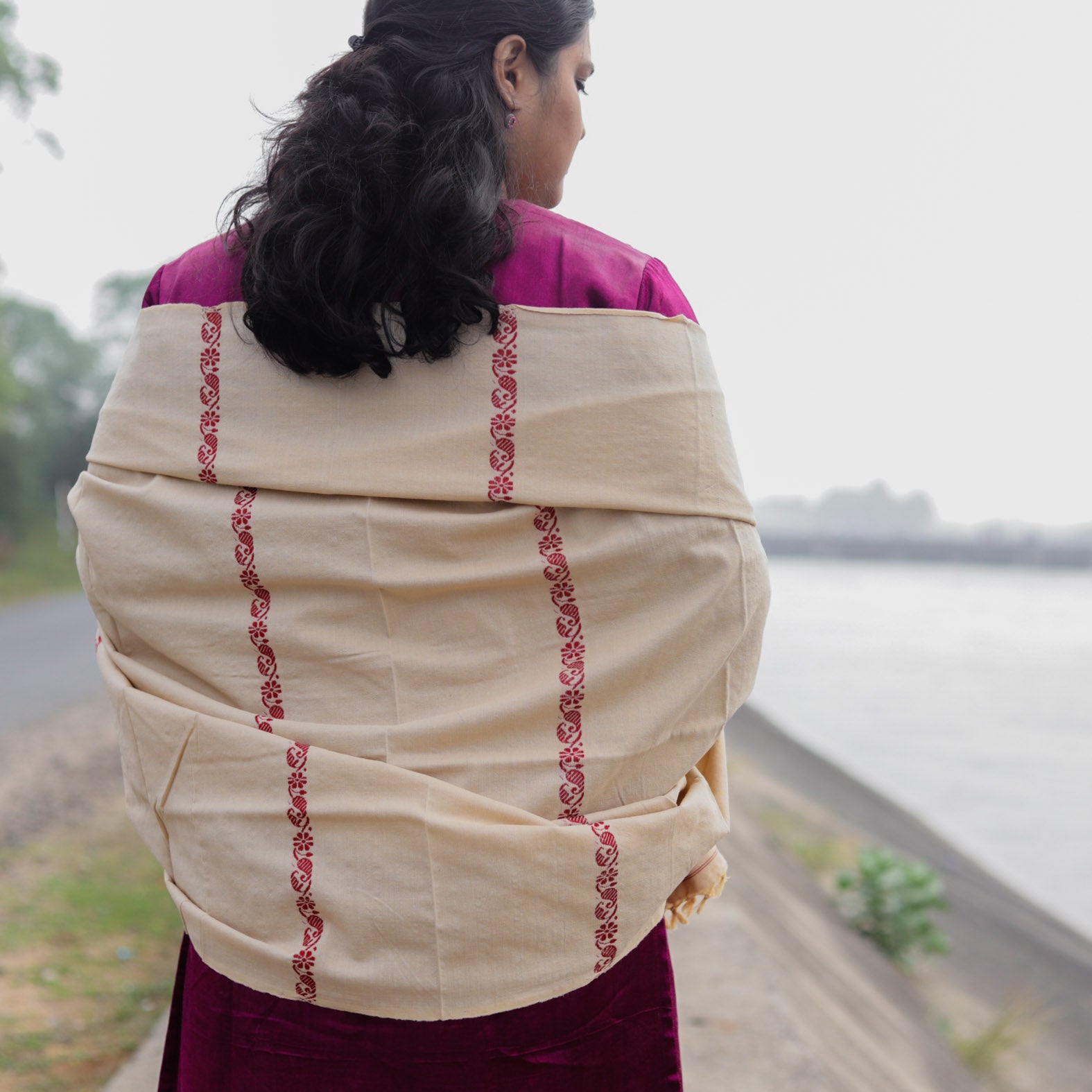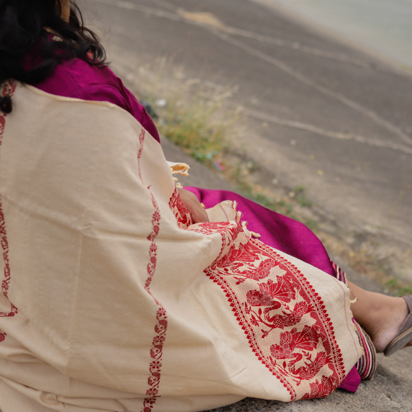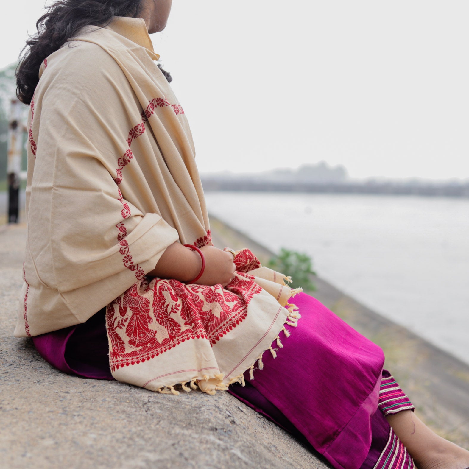 Wrap yourself in cozy elegance with our woollen shawl for women. This essential accessory is perfect for everyday wear, keeping you warm and stylish. In Bengal, shawls were introduced during the early seventeen century where the most prized woven shawls were figurative woven on the complex Naksha loom. BONGONIKETAN reintroduces the Baluchari Shawls of Bengal handwoven on cotton wool, it's a must have addition to your wardrobe.