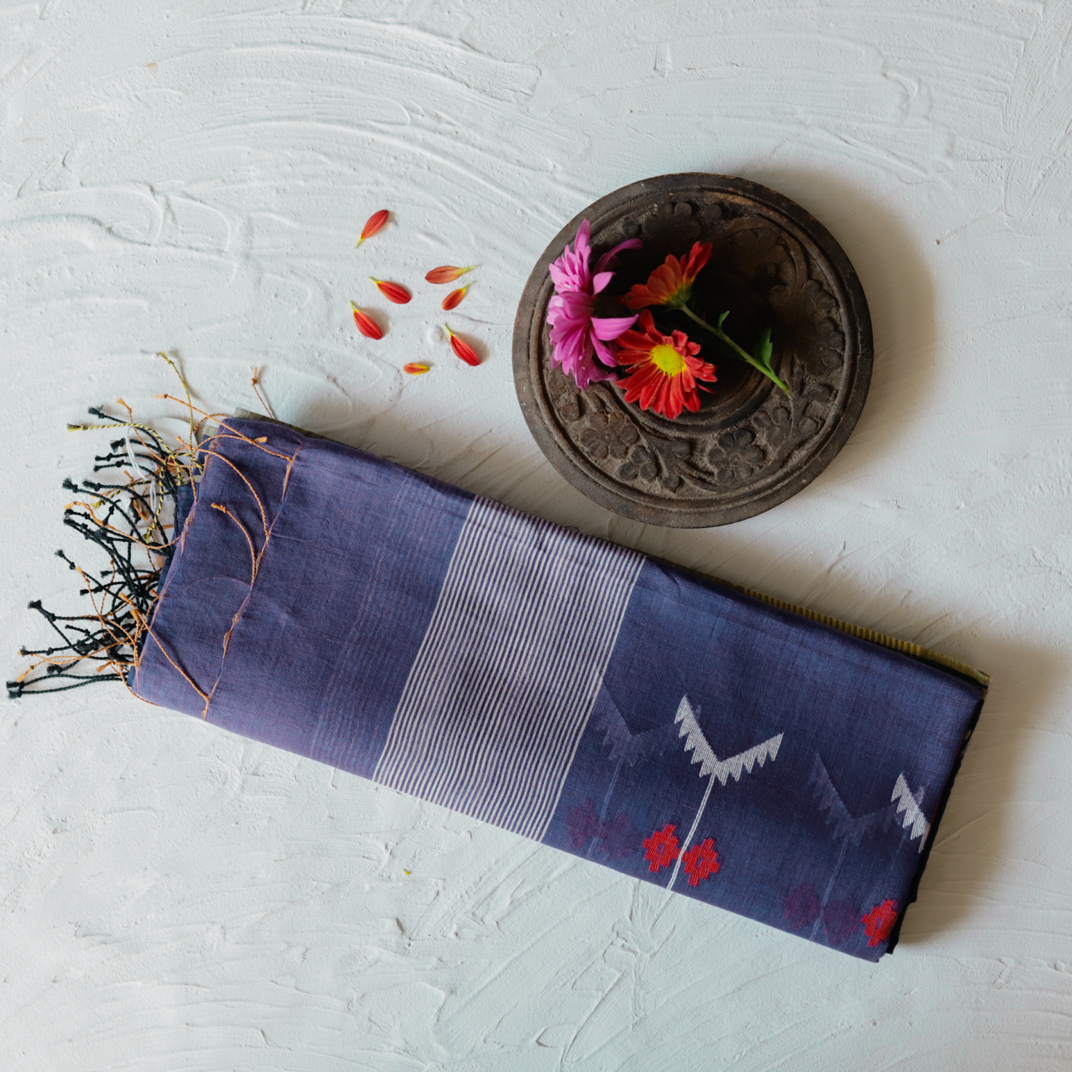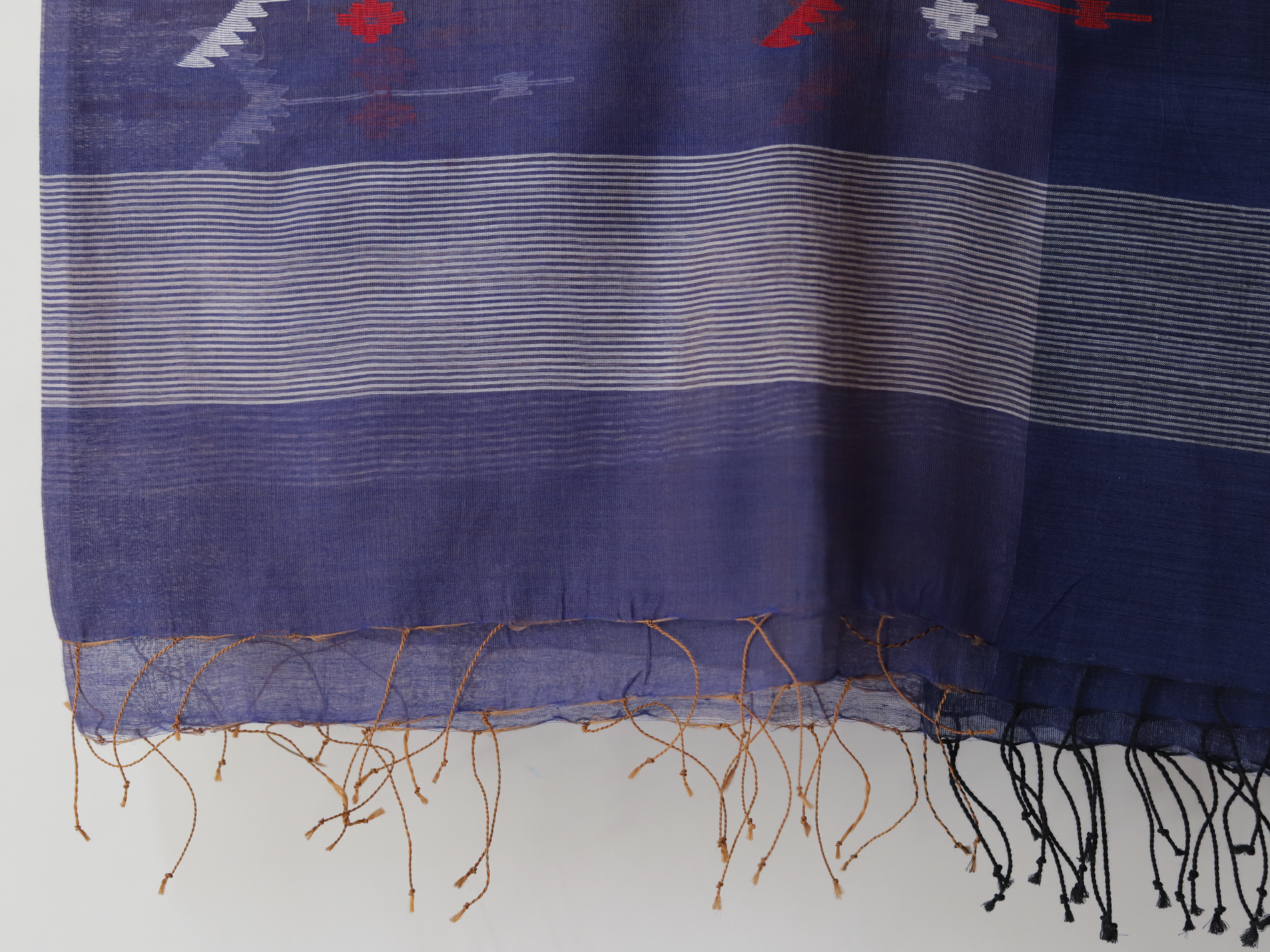 This dupatta is made of the finest cotton fabric handwoven in West Bengal. Being lightweight, it has a lovely luster. It can be easily carried, feeling like a second skin. The dupatta is in a Jamdani weave of West Bengal by BONGONIKETAN!