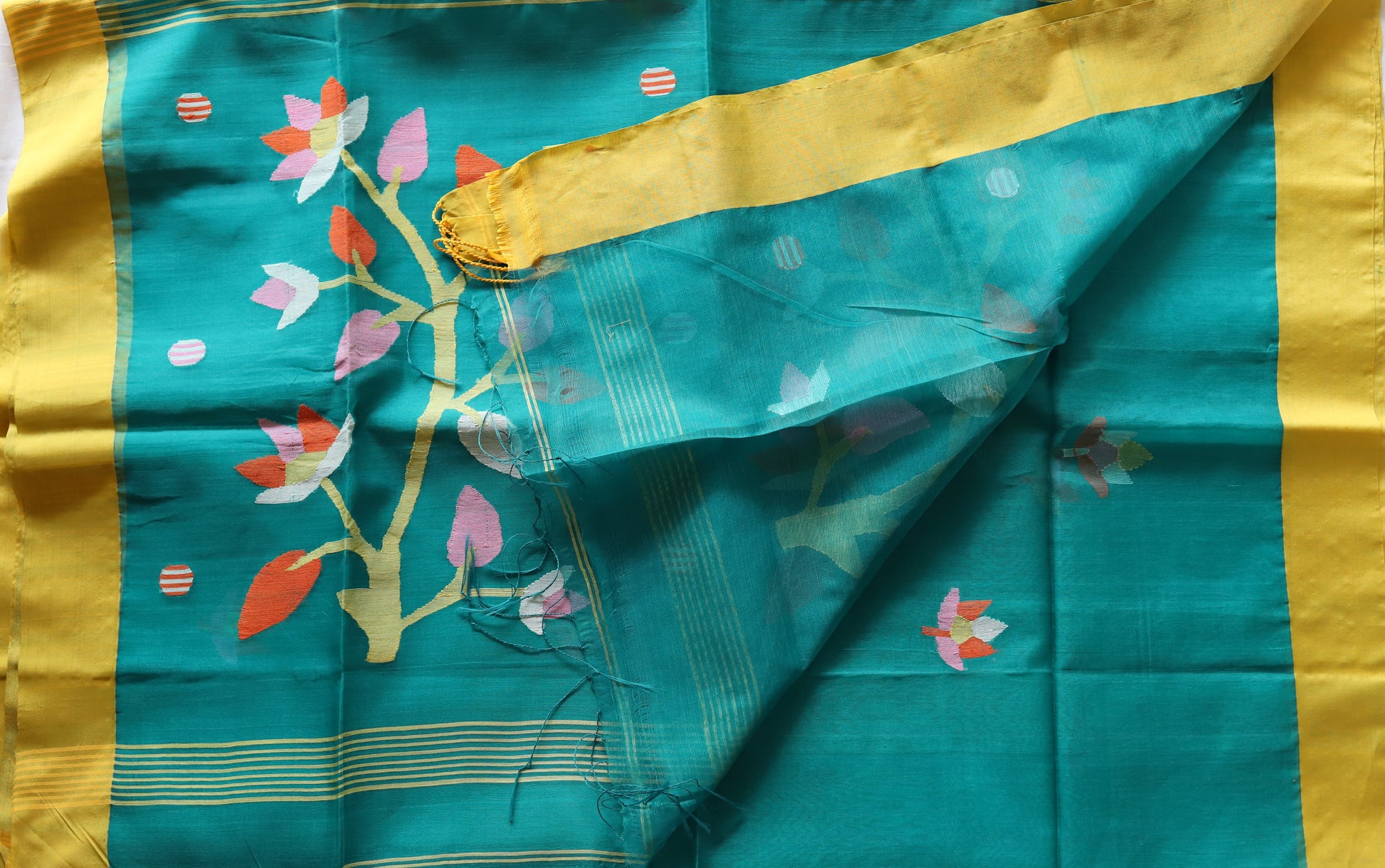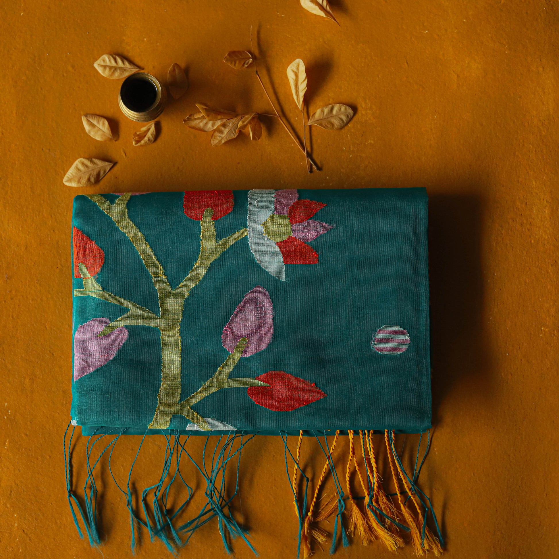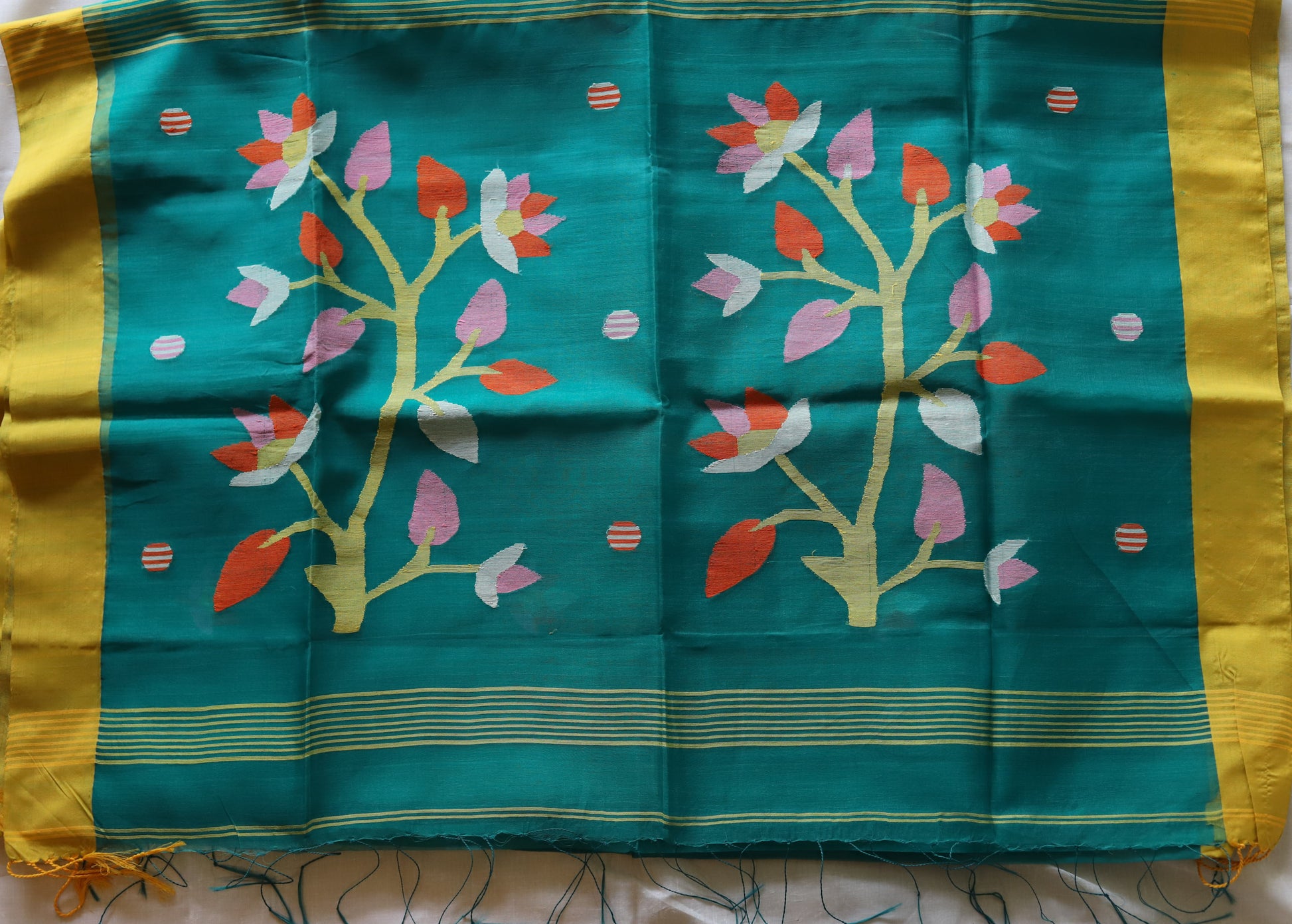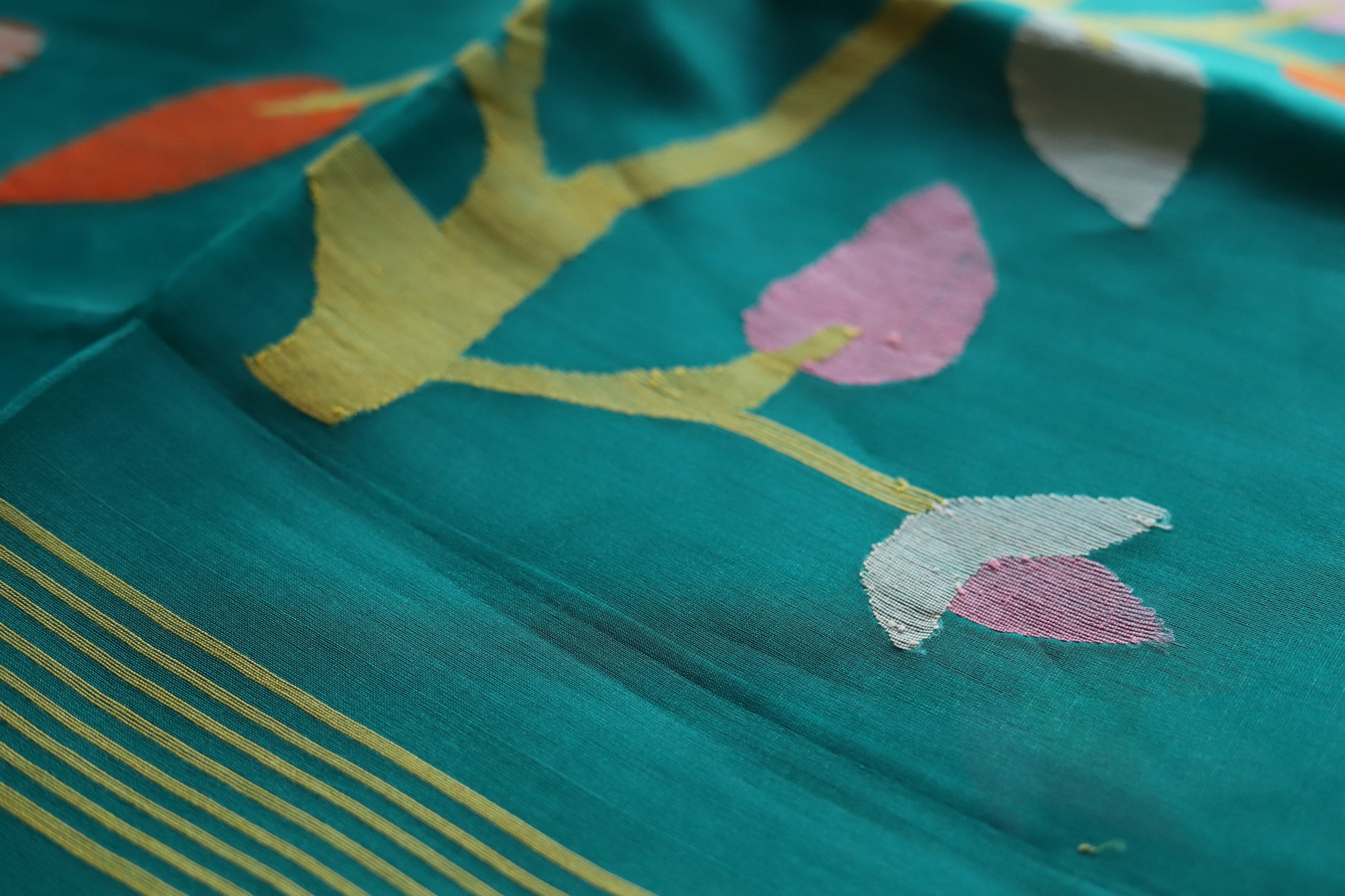 This is a handwoven saree that is meticulously created by the artisans of Bengal. The art of hand weaving is labour intensive and takes a longer time. But, the beauty it adds to the fabric is priceless.