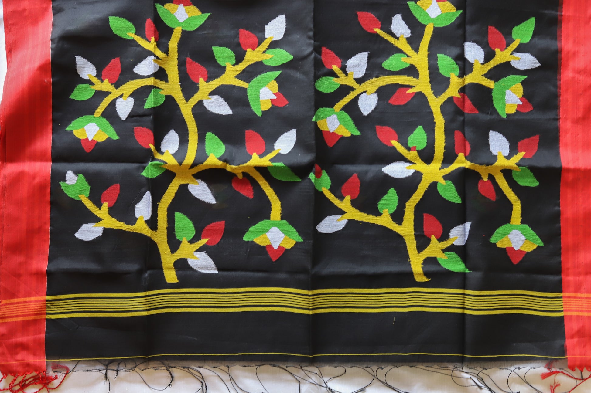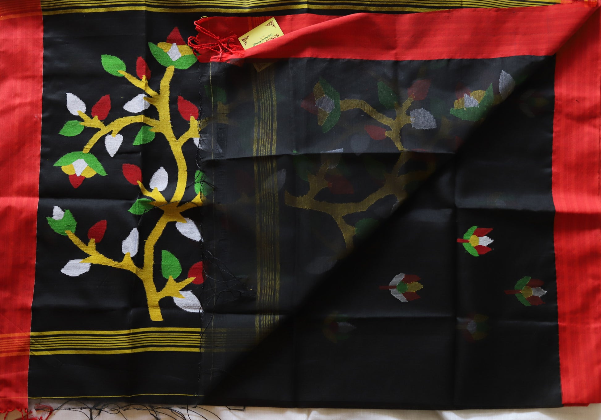 This is a handwoven saree that is meticulously created by the artisans of Bengal. The art of hand weaving is labour intensive and takes a longer time. But, the beauty it adds to the fabric is priceless.