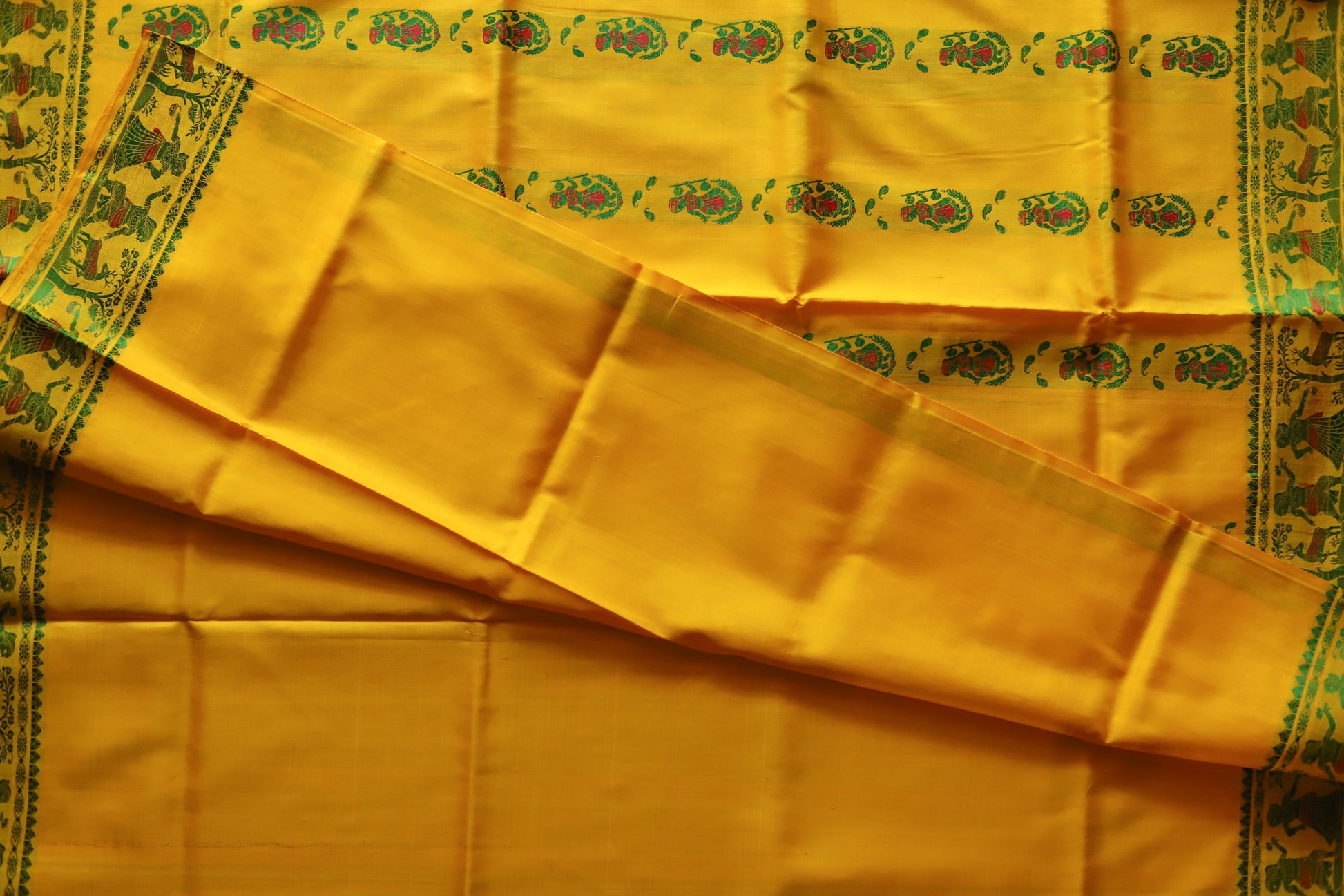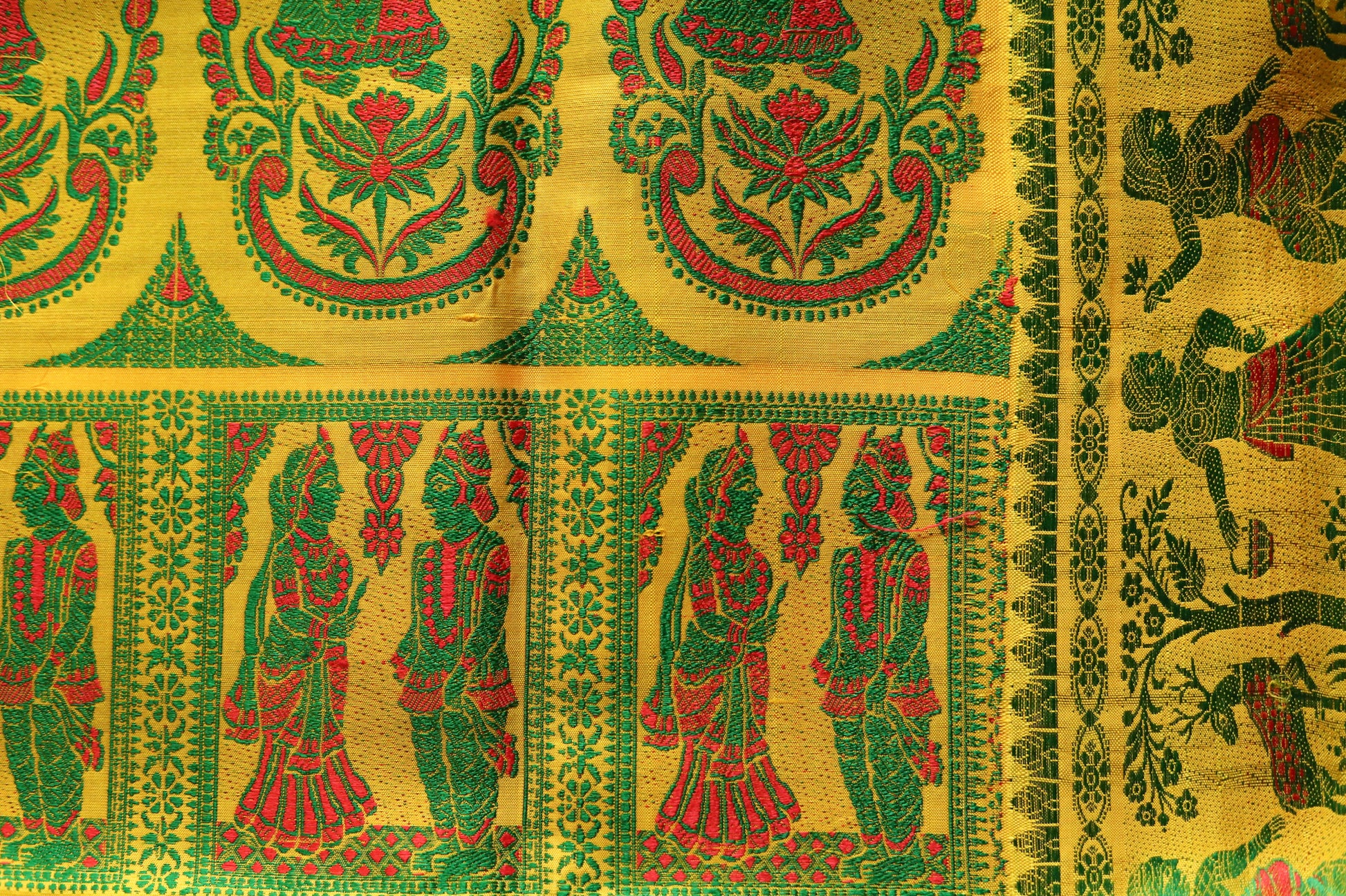 Originating in the 18th century from the historic village of Baluchar in Murshidabad, this weave was patronised by Bengal’s Nawabs and admired by European traders for its sophistication. What makes Baluchari truly iconic is its elaborately woven pallu, depicting narrative scenes from the Ramayana, Mahabharata, temple sculptures, royal courts and mythological motifs, each pallu crafted like miniature storytelling panels on pure silk.