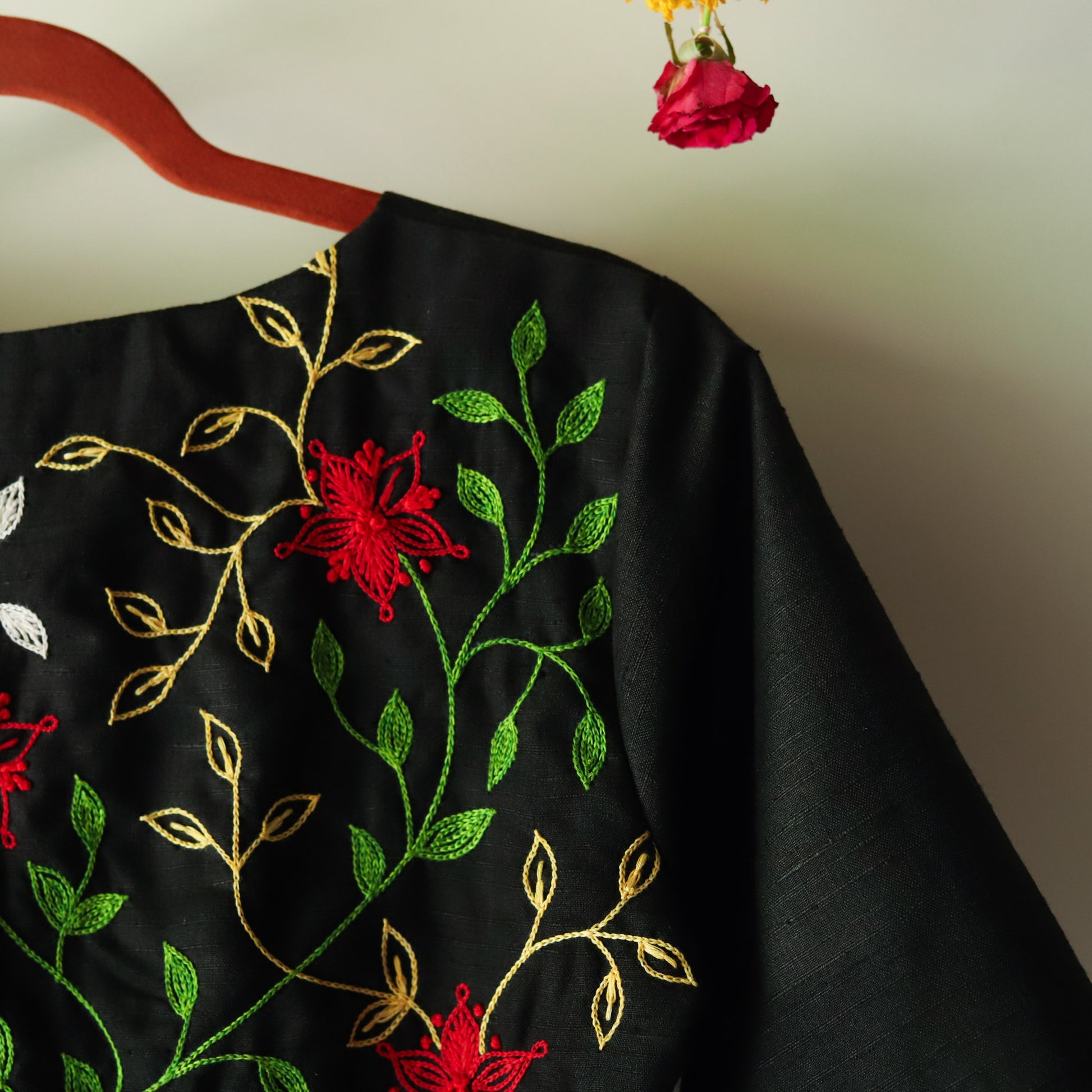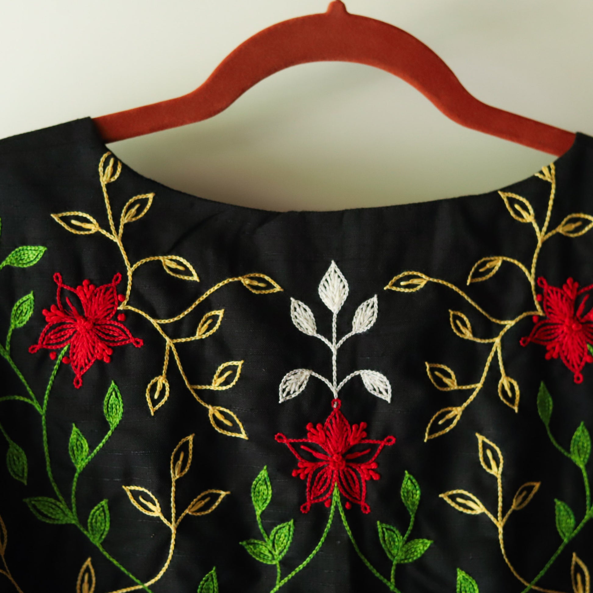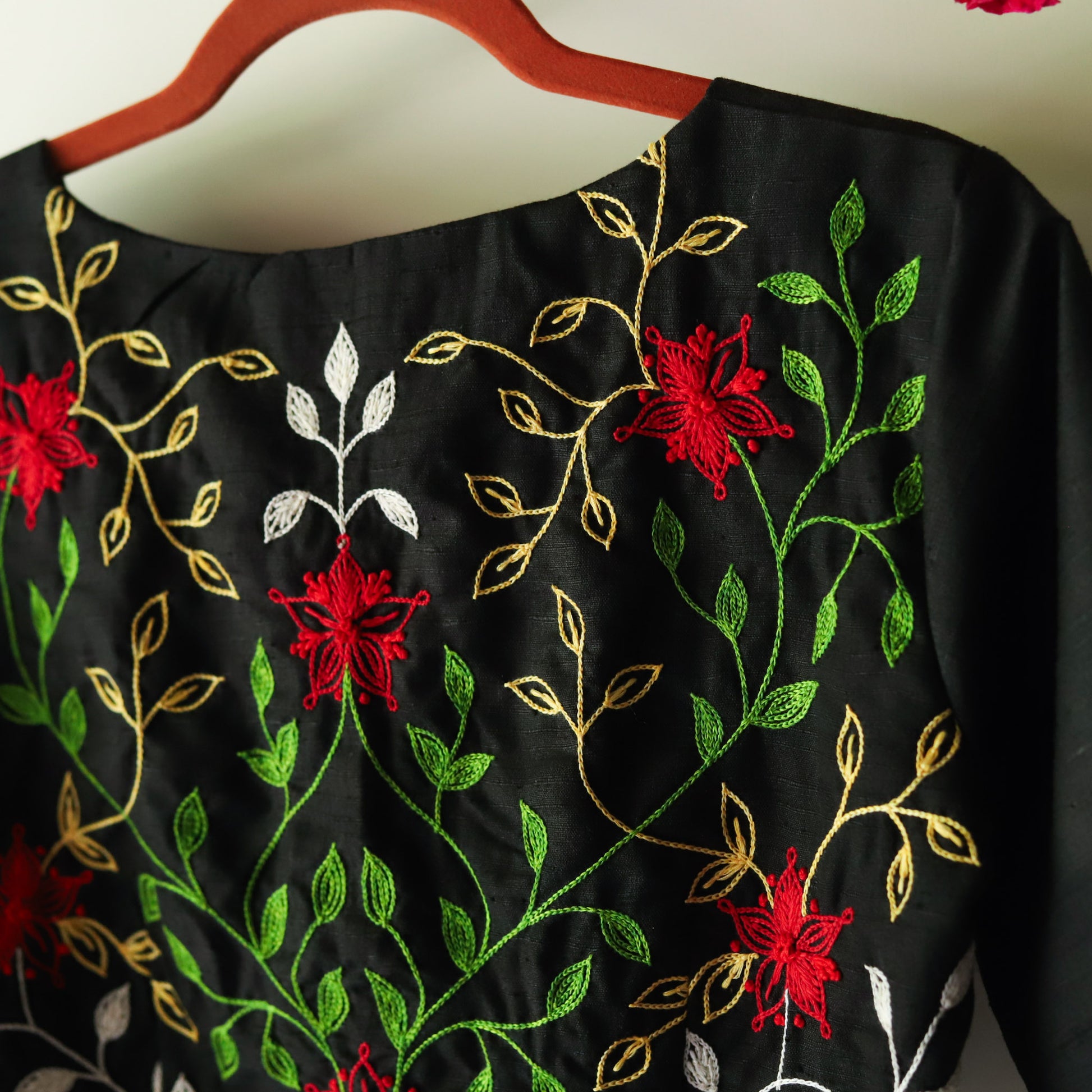 TITLI collection of blouses reminds of light weight with intricate patterns or designs. We present to you Titli blouse which is the best deal you can have as made its solely for you. Its perfect for all the special occasions. Also perfect summer blouse. This blouse is elegant and versatile with back hand embroidery work in pure raw silk fabric.