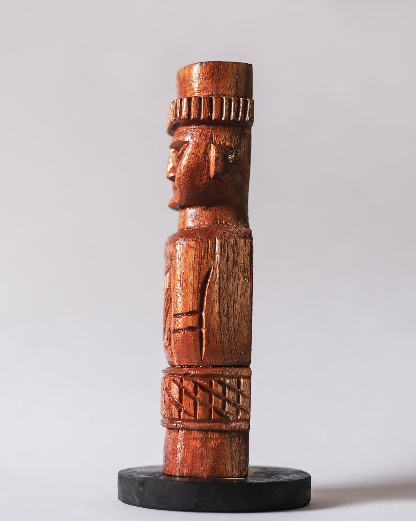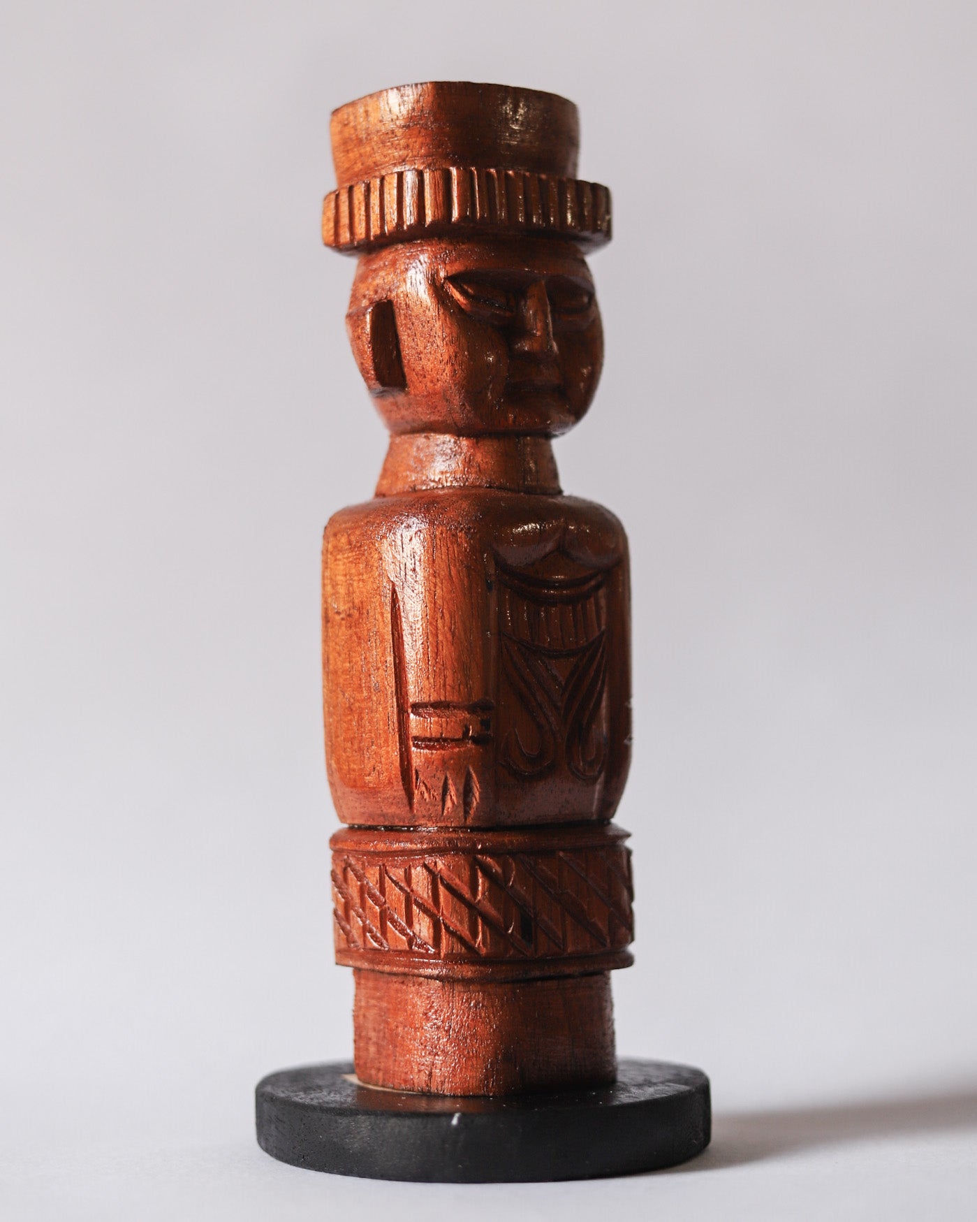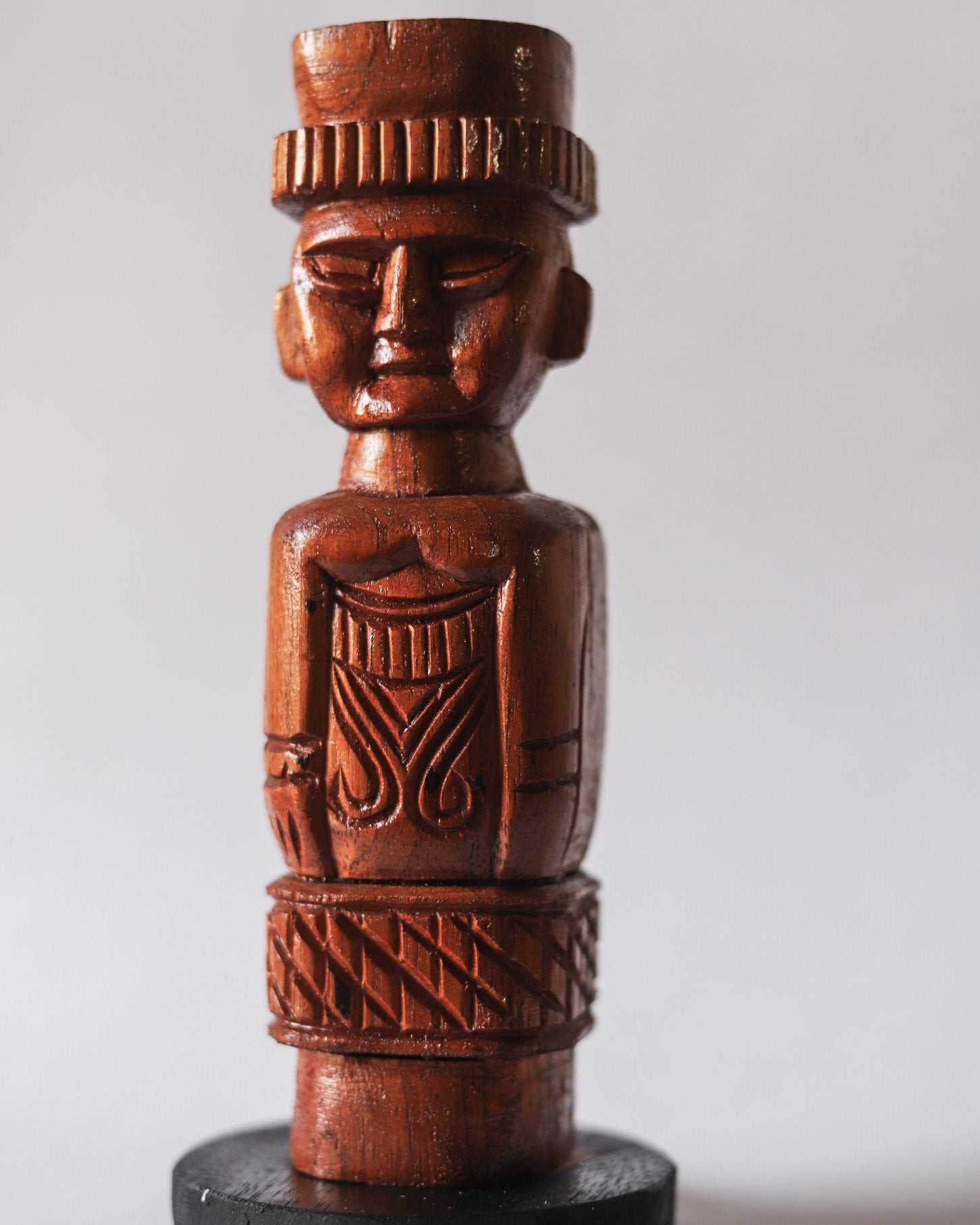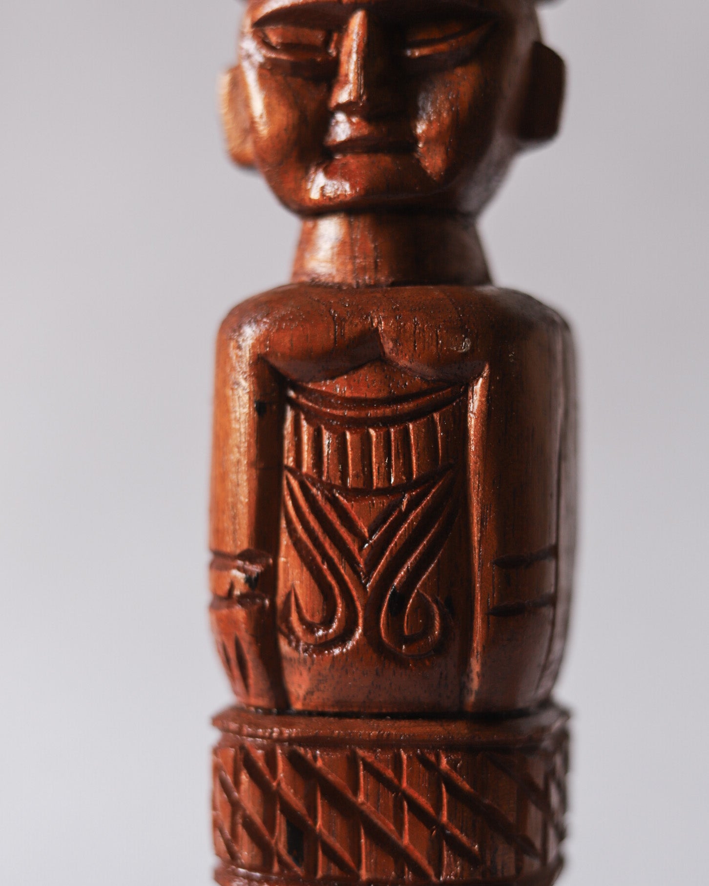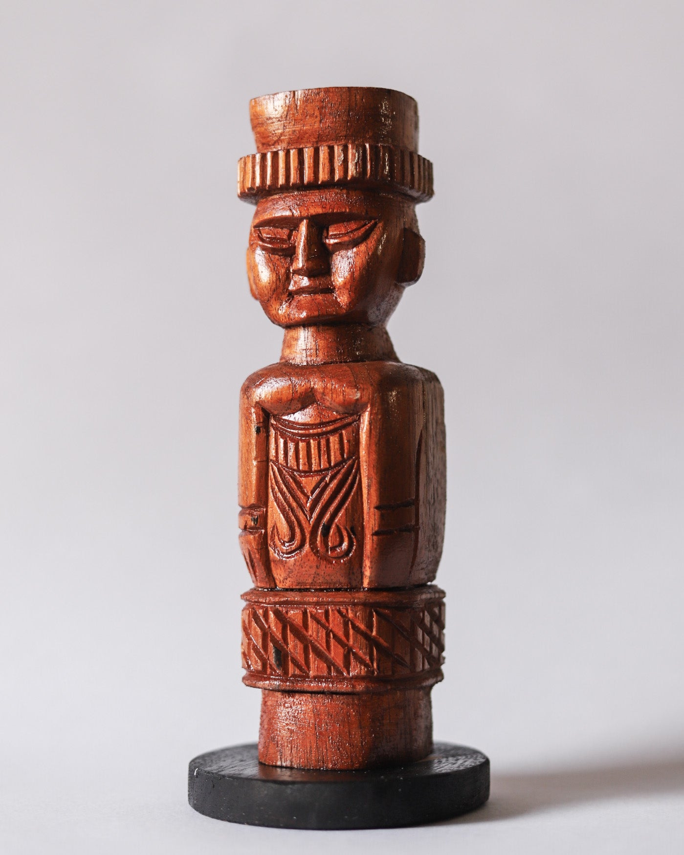 This exquisite hand-carved wooden figurine showcases the rich artistic heritage of West Bengal, representing authentic Bengali wooden doll craftsmanship that reflects centuries-old folk traditions. Meticulously crafted by skilled artisans from Natungram in Purba Bardhaman district, each sculpture is carved from carefully selected authentic gamhar wood blocks using traditional techniques. The master craftsmen begin by sketching meticulous figures onto wooden blocks, then use skilled hands to chisel away and bring these figures to life, carefully cleaning and smoothing the carved surfaces to perfection. The natural wood is then polished to achieve the rich reddish-brown finish, highlighting the intricate carved details and geometric patterns. Specific motifs and designs are delicately marked using fine brush strokes, with facial features added as the final touch of finesse.