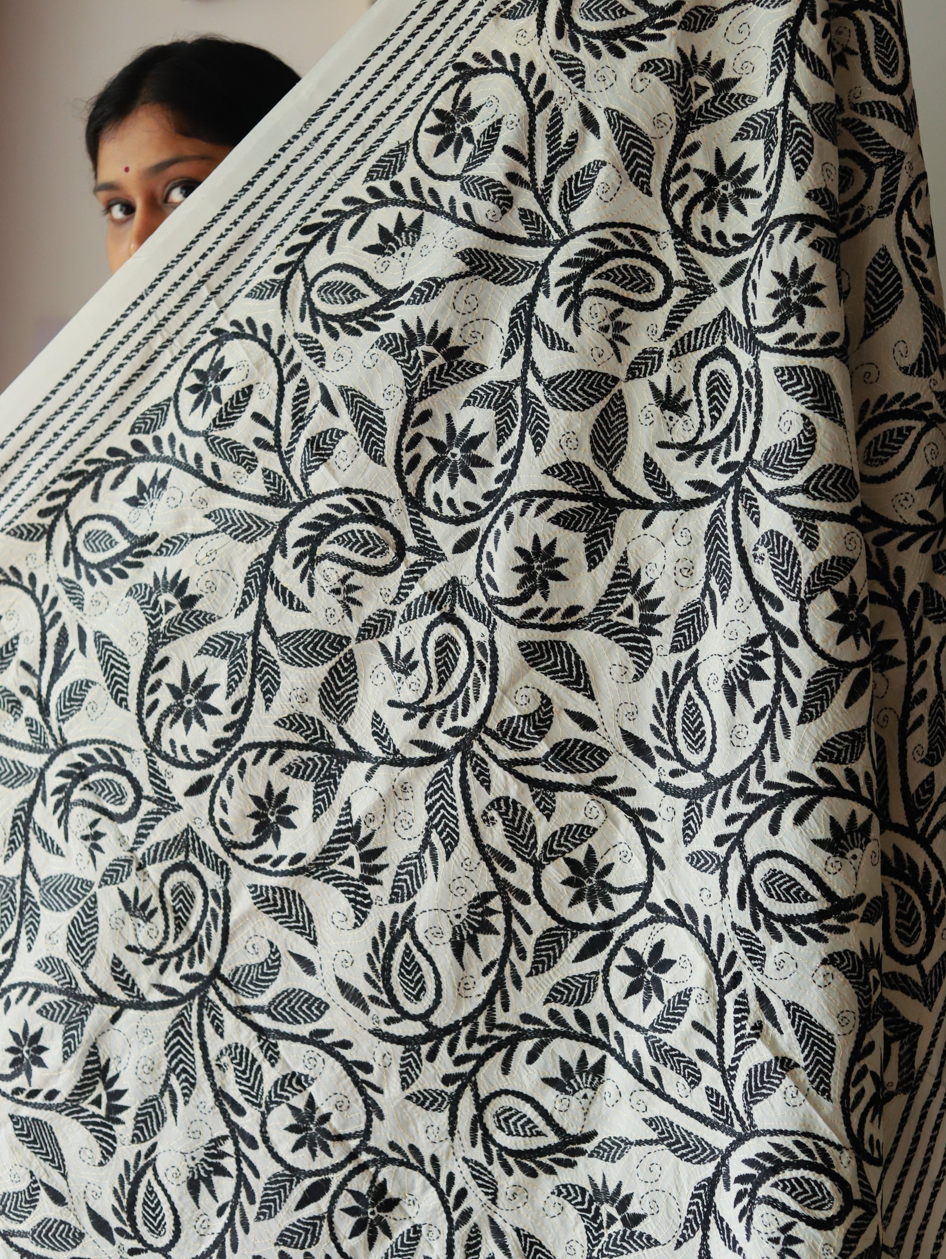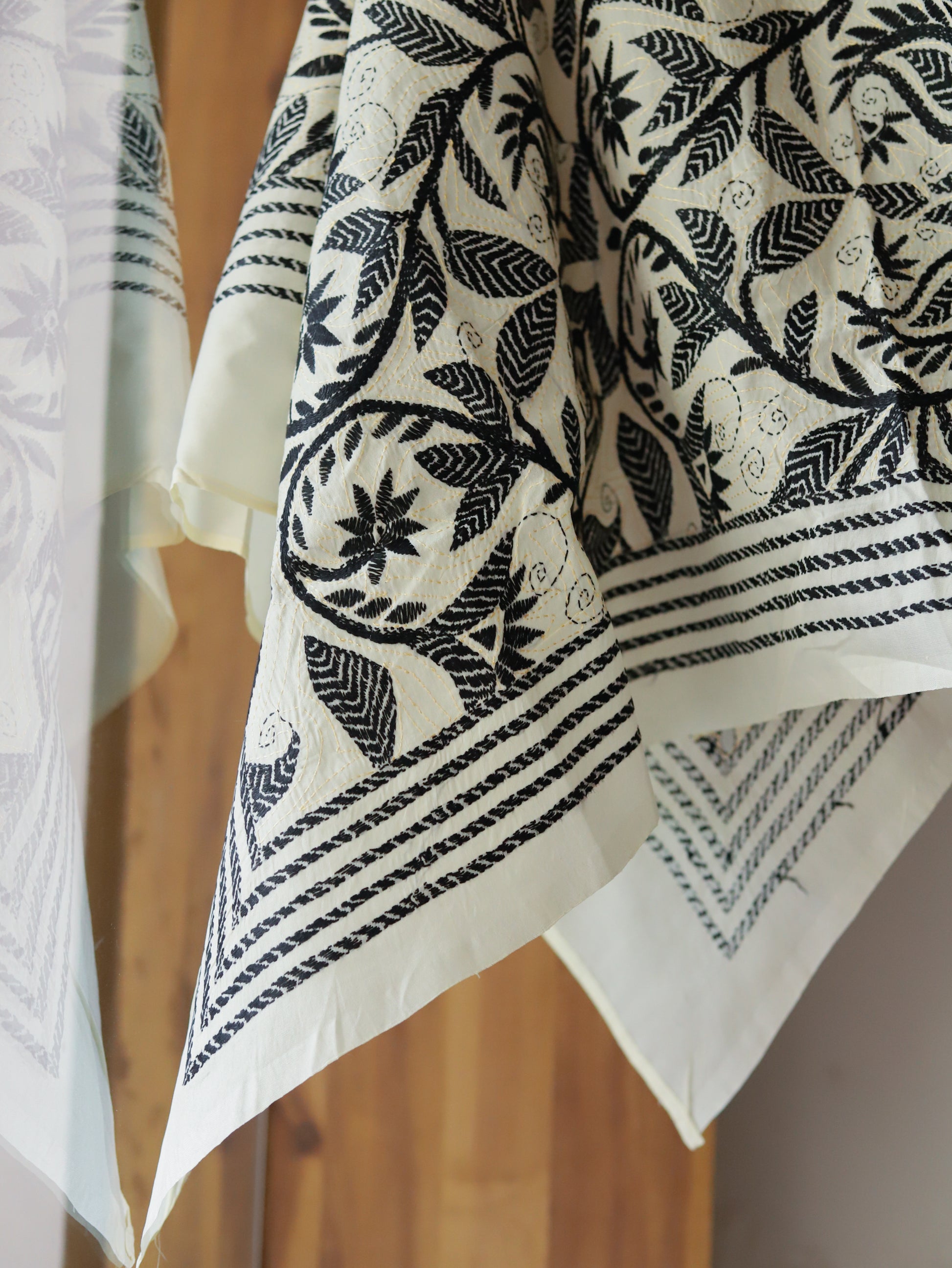 Kantha, the ancient running stitch embroidery of Bengal, adds intricate patterns and vibrant character to these elegant scarves. The lightweight yet sumptuous texture makes these versatile pieces perfect for both everyday elegance and special occasions.