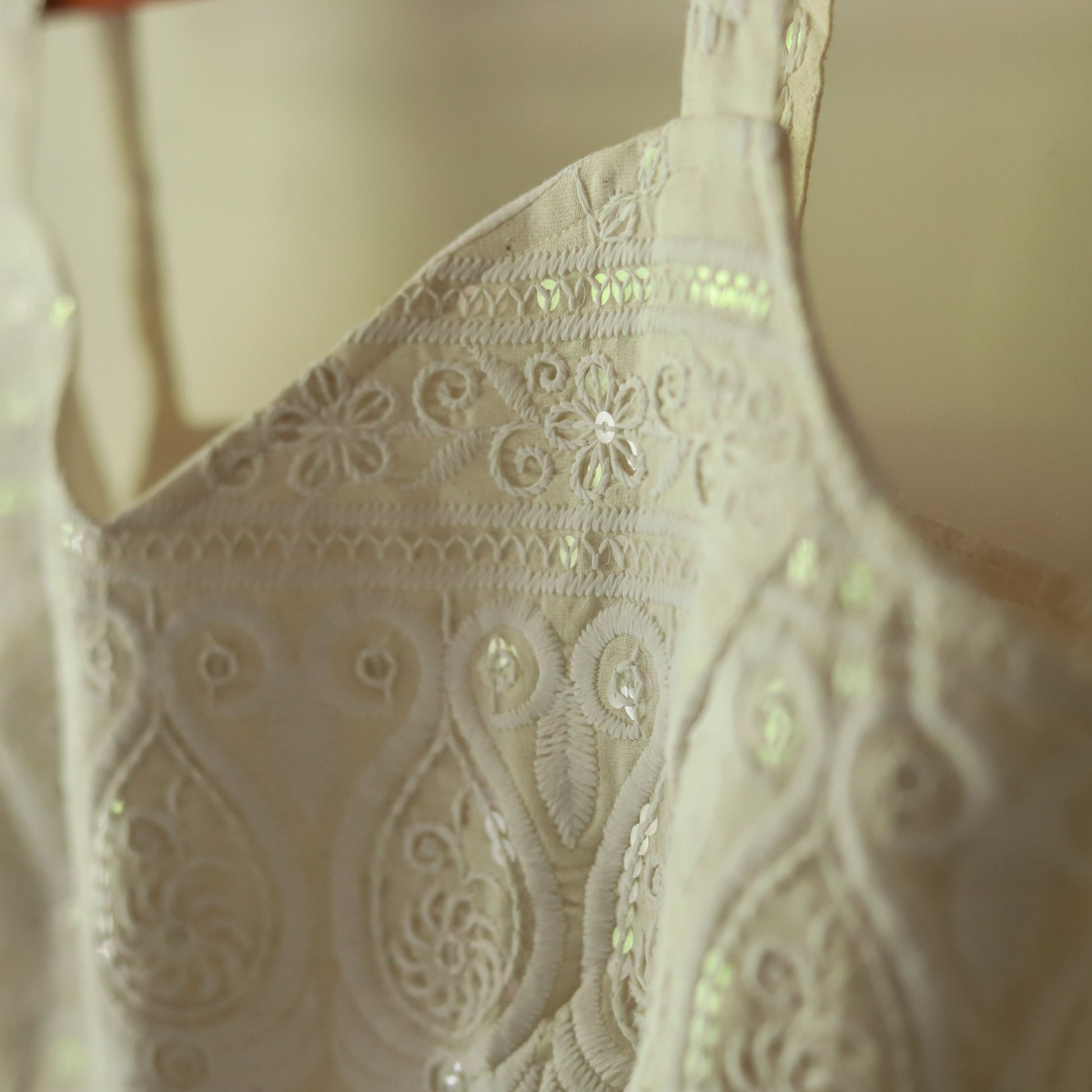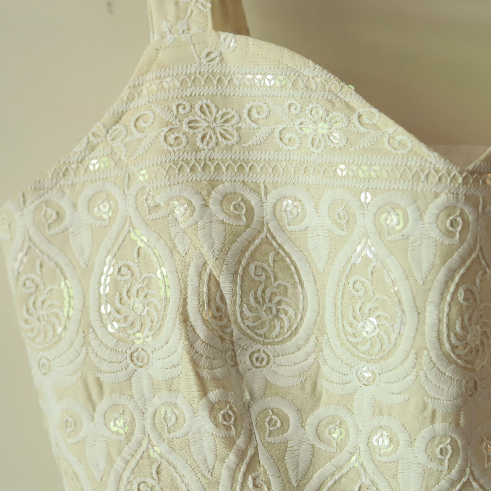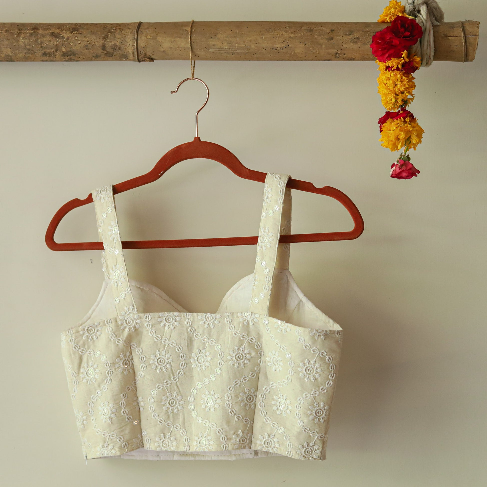 TITLI collection of blouses reminds of light weight with intricate patterns or designs. We present to you Titli blouse which is the best deal you can have as made its solely for you. Its perfect for all the special occasions. Also perfect summer blouse. This straps blouse has sequence work with embroidery through out on pure cotton.