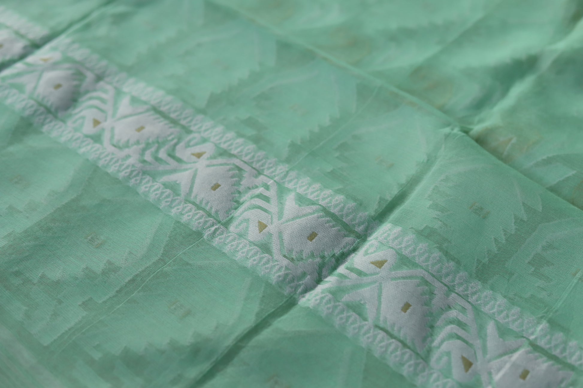 Our Konkona sari presents the quintessential Jamdani weave in fine cotton silk. Rooted in the original Dhakai Jamdani design language, this saree features Butidar motifs (small repeated butis) across the body, arranged in a balanced grid, and a Kharibel pallu, defined by horizontally aligned running figures that frame the saree with continuity and structure. The border extends this composition into a defined arrangement, completing the design narrative.