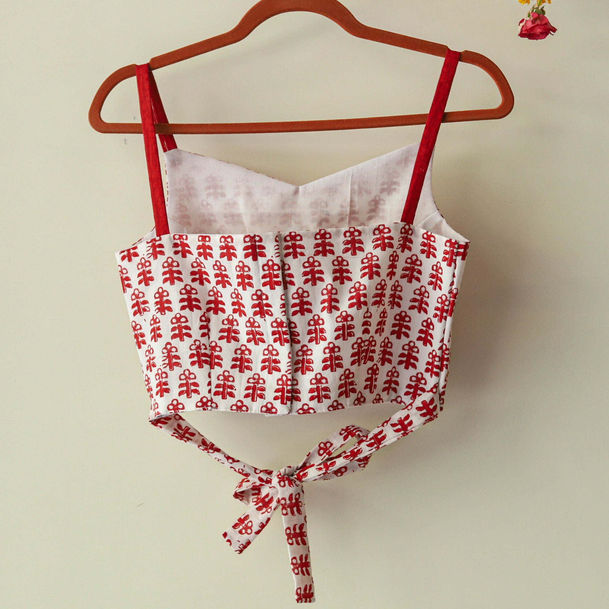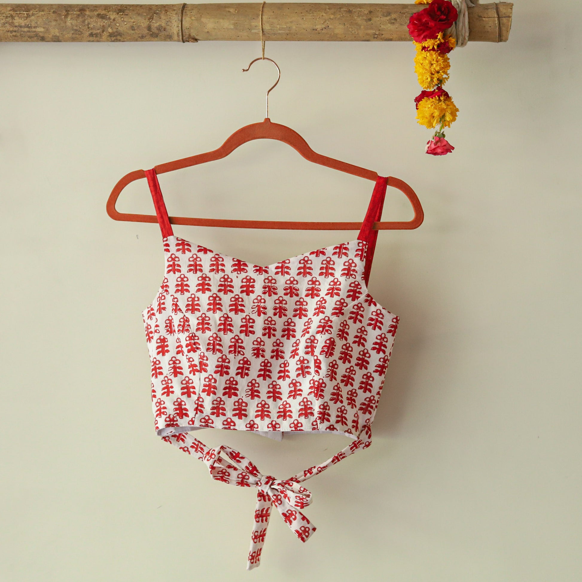TITLI collection of blouses reminds of light weight with intricate patterns or designs. We present to you Titli blouse which is the best deal you can have as made its solely for you. Its perfect for all the special occasions. Also perfect summer blouse. This straps blouse has block print of organic dye in pure cotton with straps given to tie in front.