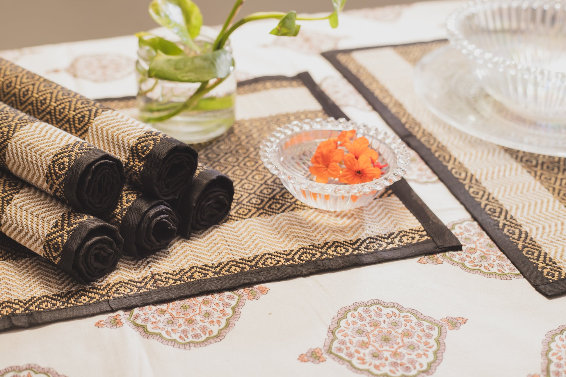 Some pieces stand out and need less in terms of accessorization. Seen here such is our Handcrafted अभिरुचि , Table Mats and Runner in simple and elegant colour palette played with texture and pattern.