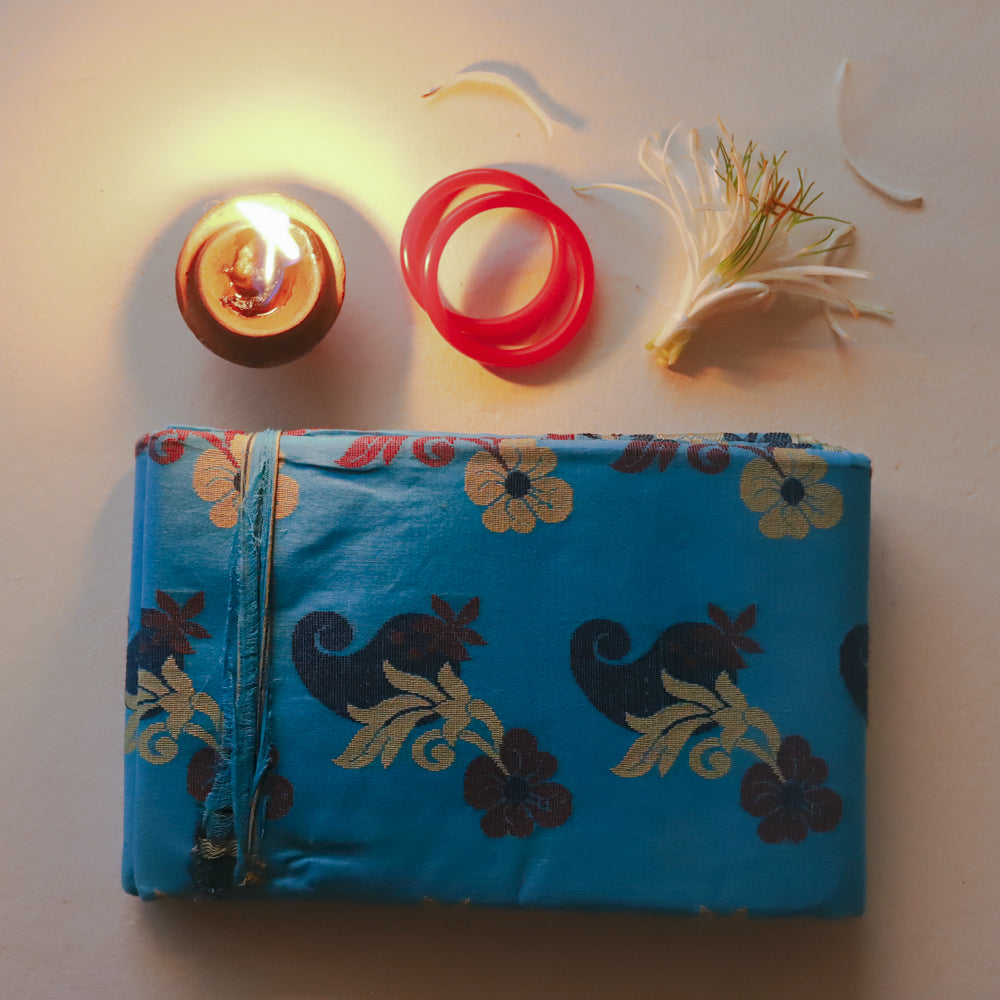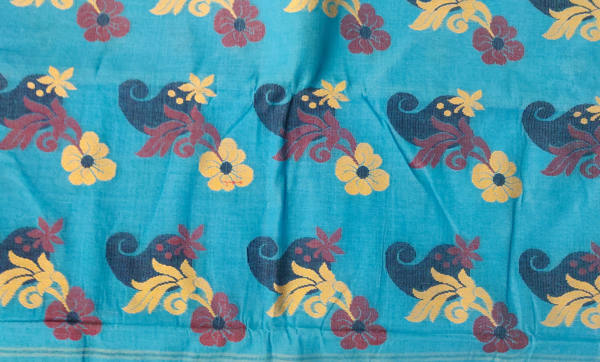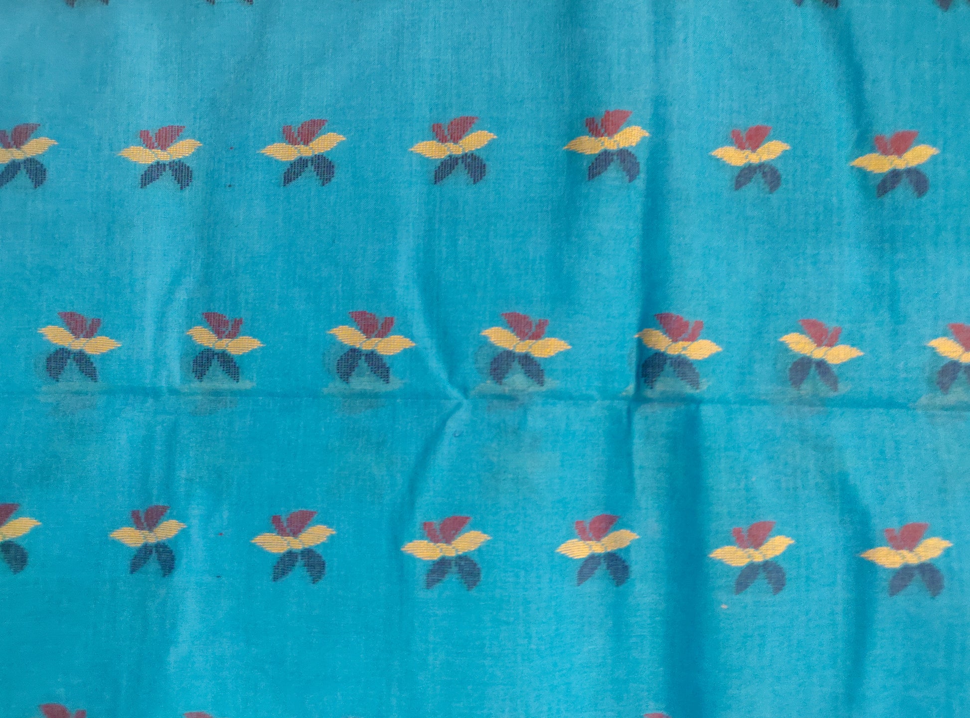The Tangail cotton is a type of fabric that is woven using hand operated looms. The warp (length) and weft (width) are interlaced and woven on a mechanised loom operated by weavers. These tangail looms do not use electricity. It takes a week's time to weave and process a saree before putting it on frame.